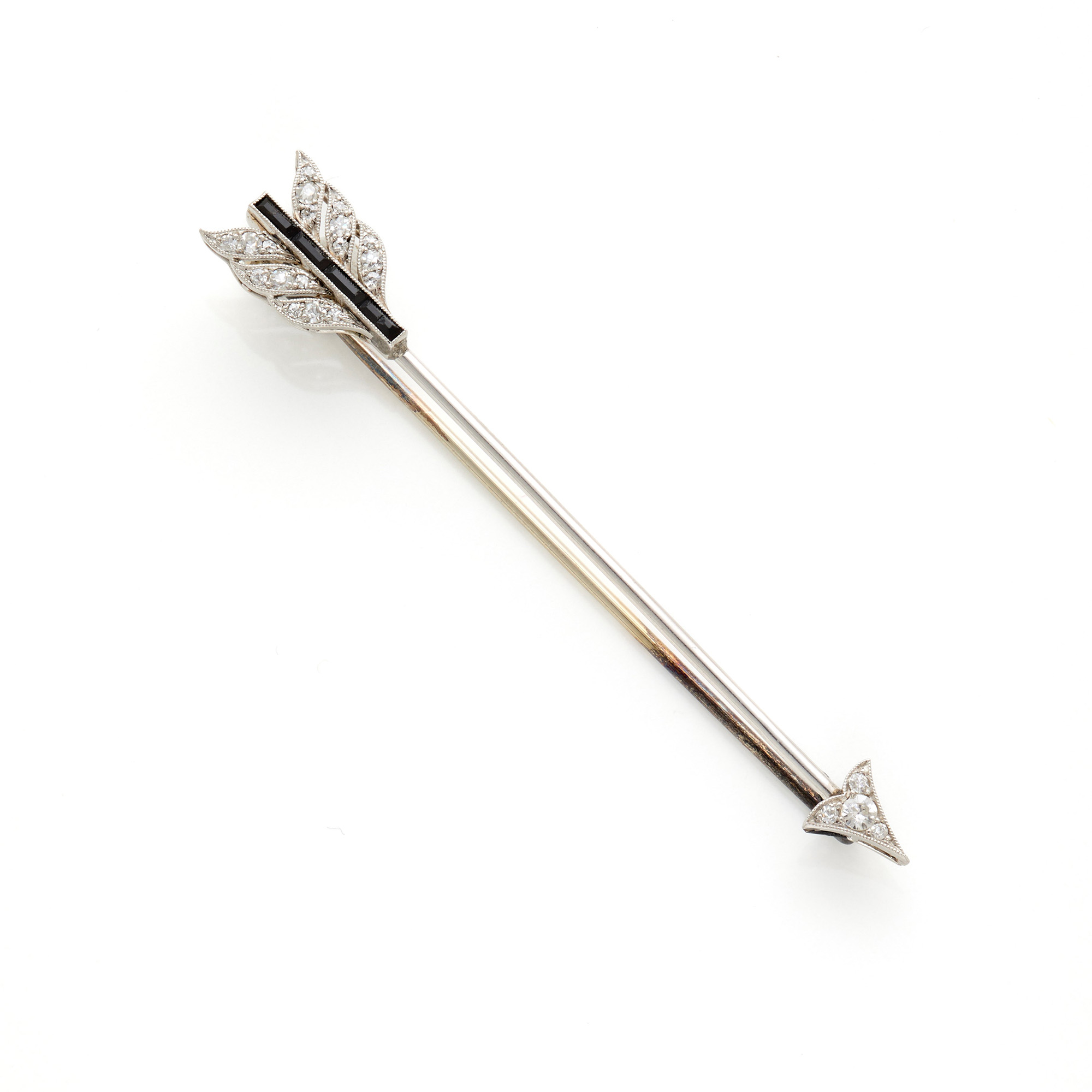 Platinum arrow brooch finished with round diamonds and onyx.