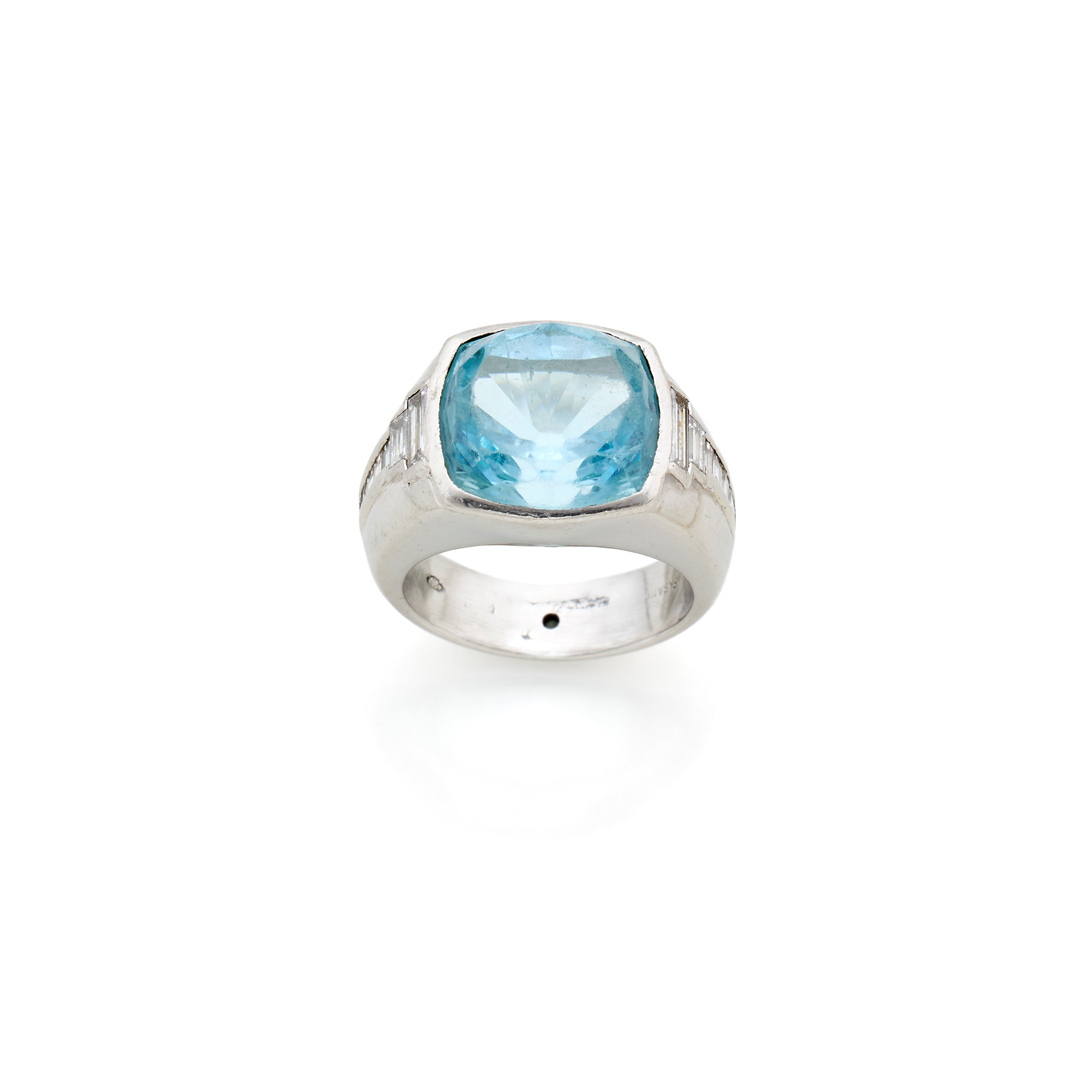 Anello Fasano in platino con topazio a cuscino di circa 11 ct e diamanti baguette per complessivi 0,50 ct circa.