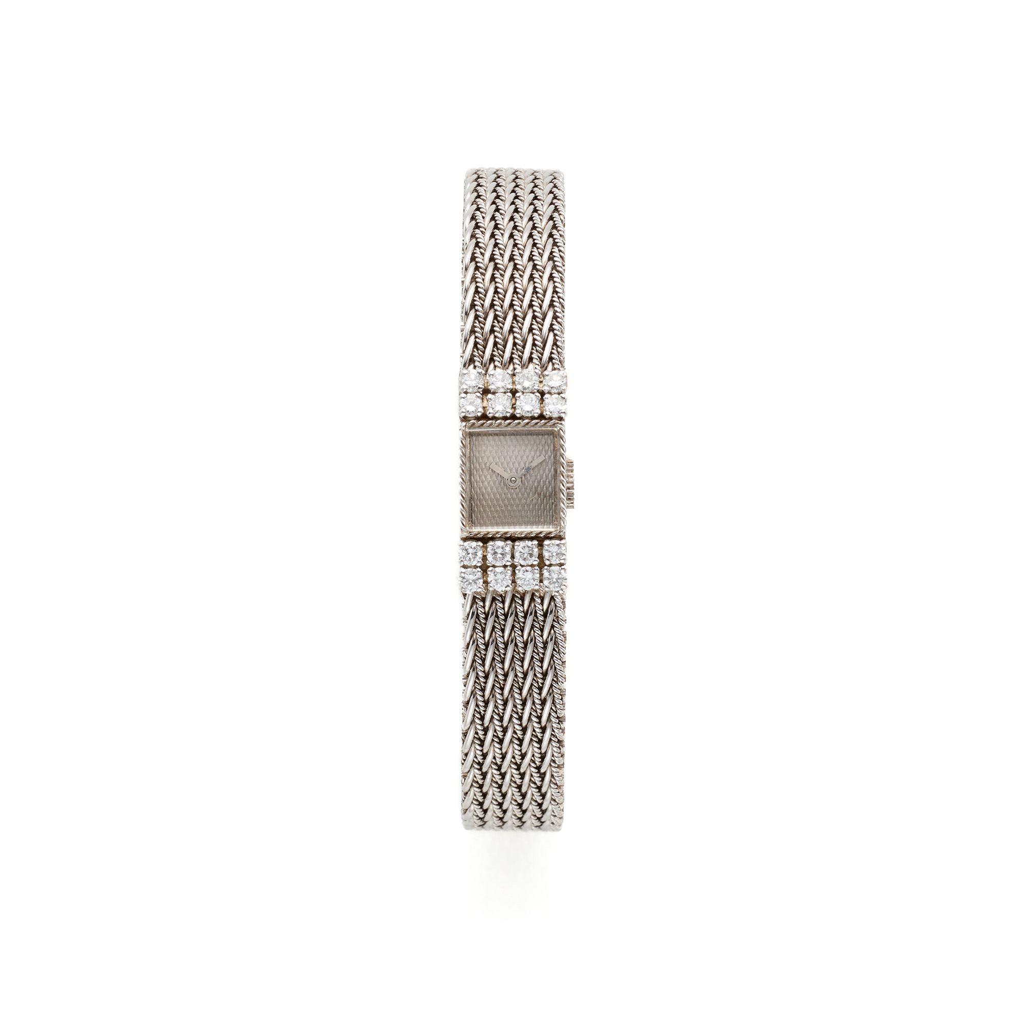 Orologio Boucheron in oro bianco 18 Kt. Cassa rifinita con diamanti rotondi e bracciale modulare. Movimento a carica manuale.. Buone condizioni.