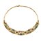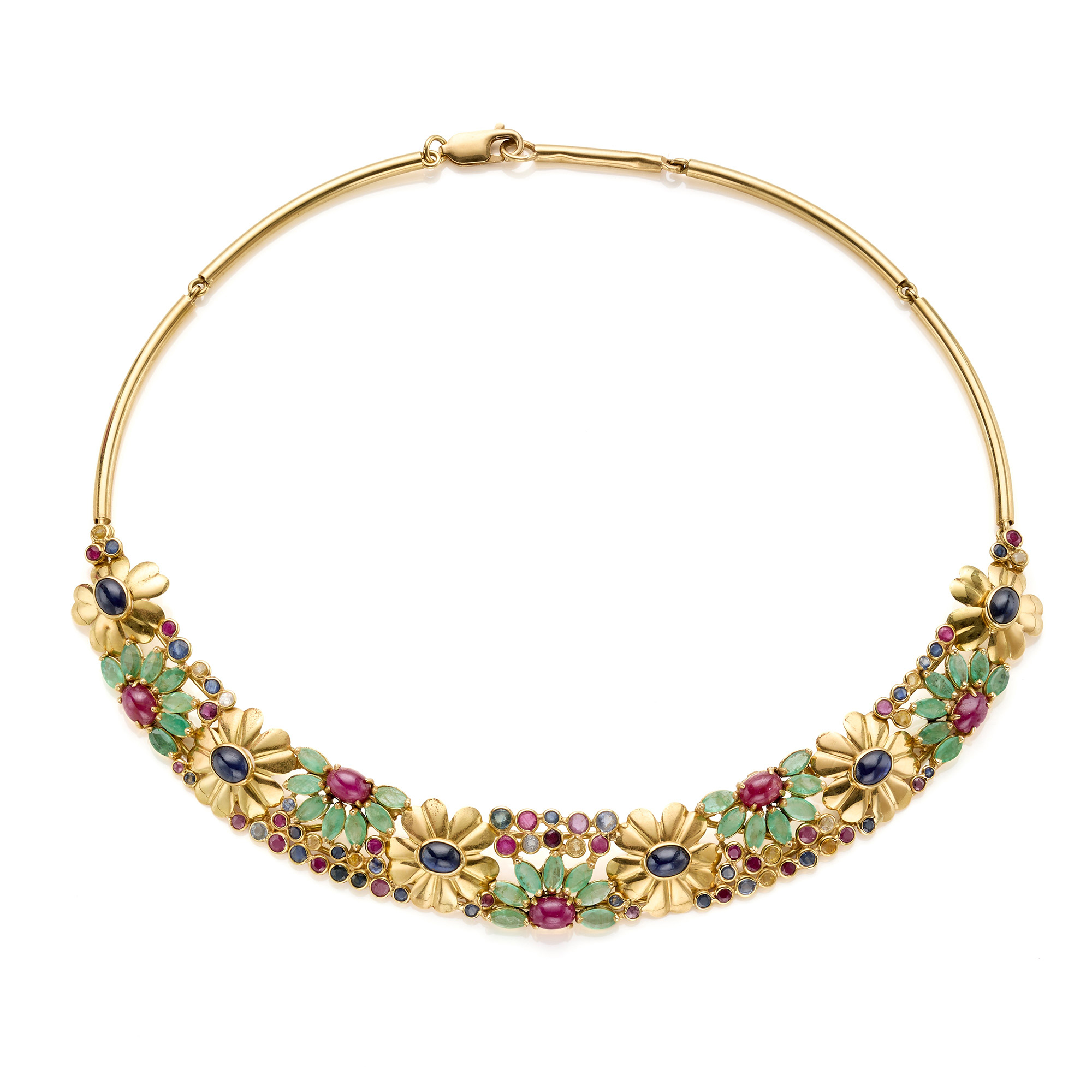 Collier semirigido modulare in oro giallo 18 Kt a decoro floreale rifinito con zaffiri, rubini cabochon e smeraldi a navette, corindoni gialli, rubini e zaffiri rotondi.