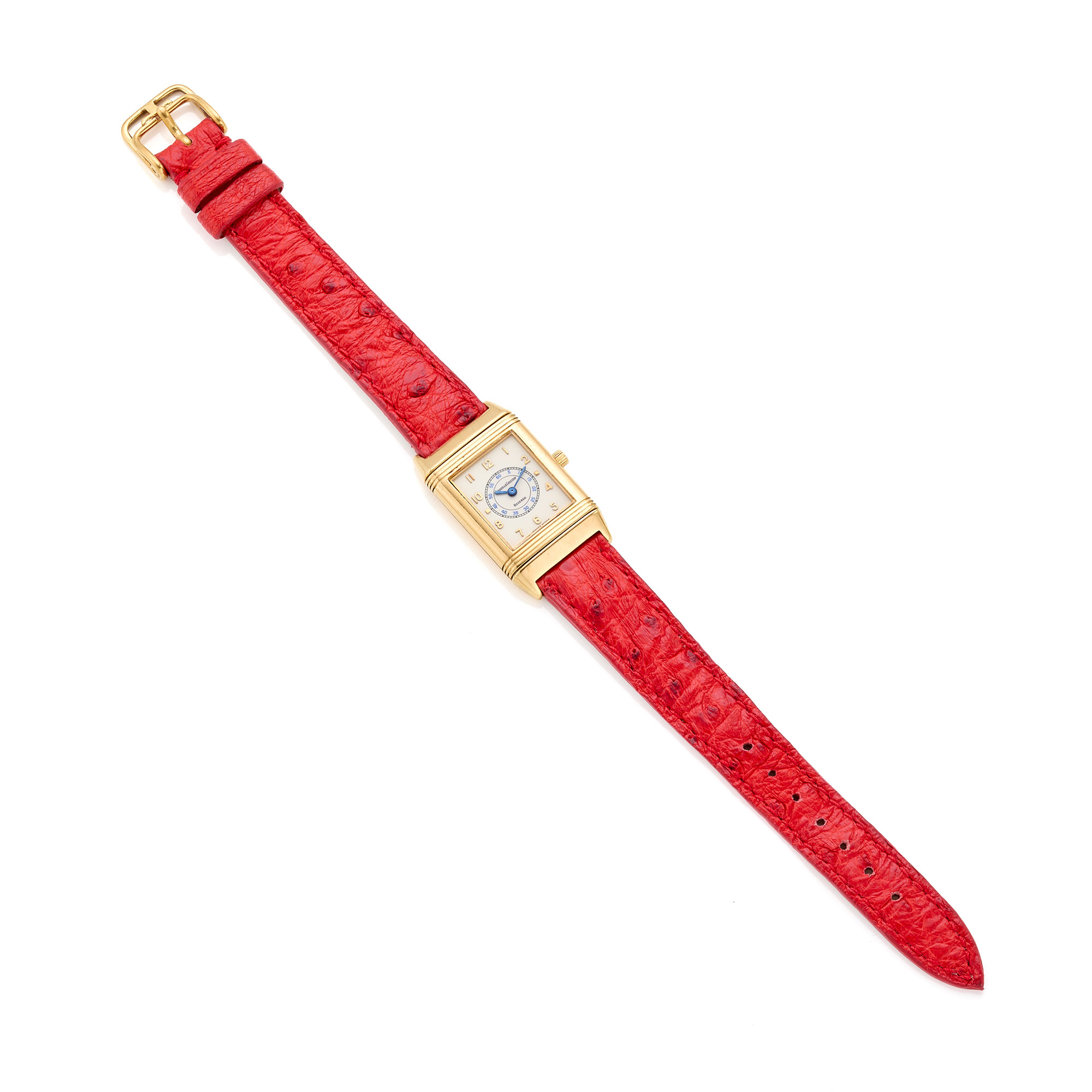 Jaeger-LeCoultre Reverso, ref. 260.1.08, anni '90. Cassa in oro giallo 18 Kt con cinturino originale in pelle di struzzo e fibbia ad ardiglione originale in oro. Movimento al quarzo con pila da sostituire.Condizioni molto buone.