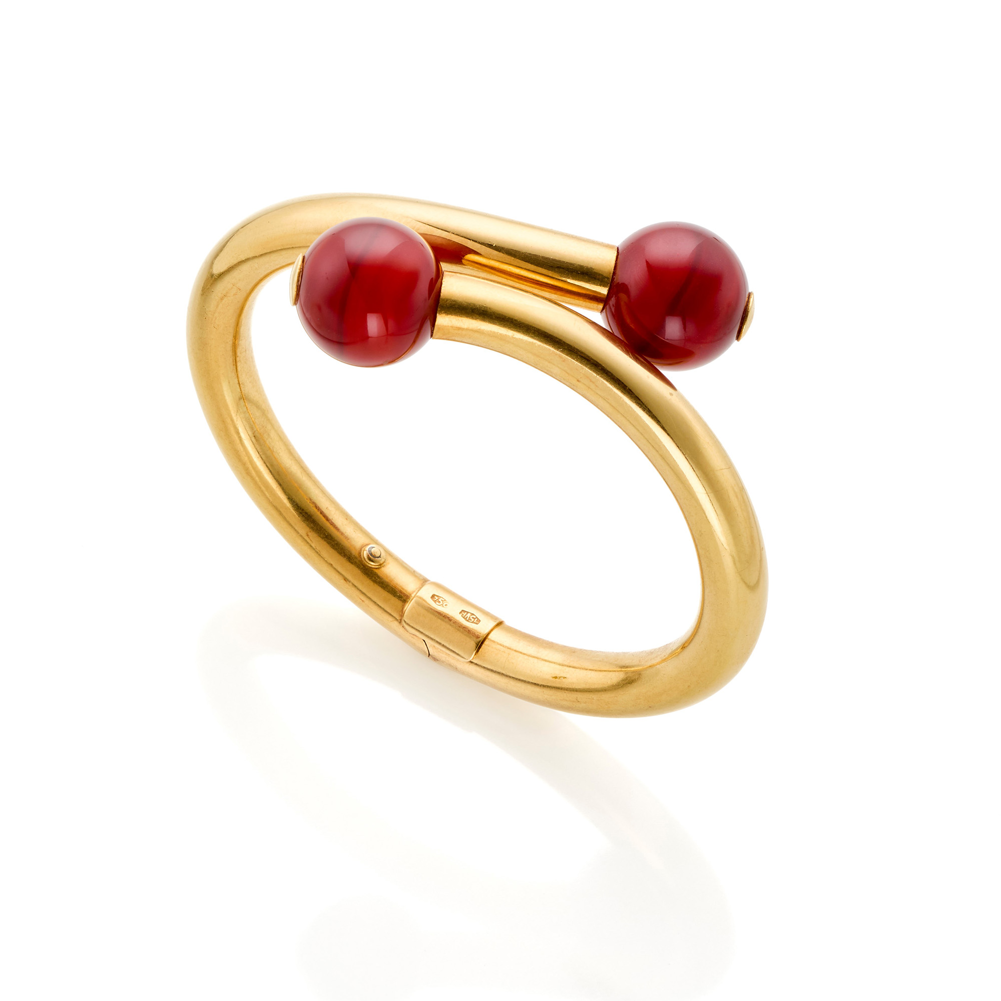 Bangle Weingrill in oro giallo 18 Kt terminato da due boules in corniola di circa 15 mm.