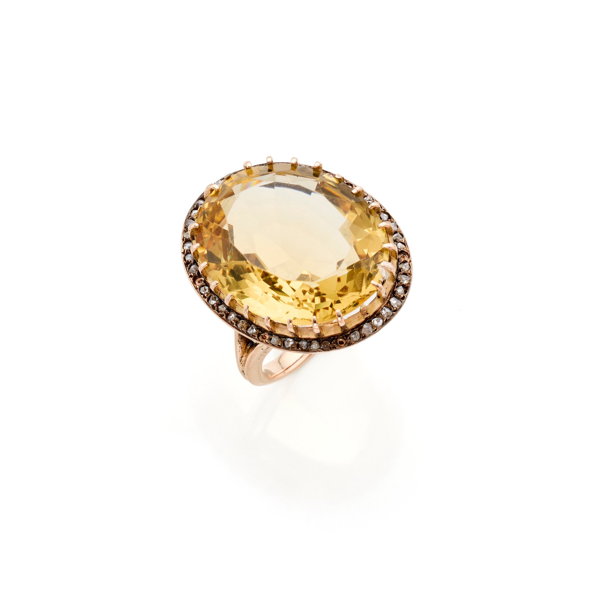 Anello in oro rosa 18 Kt con quarzo citrino ovale di circa 20 ct rifinito con diamanti mezza rosetta.