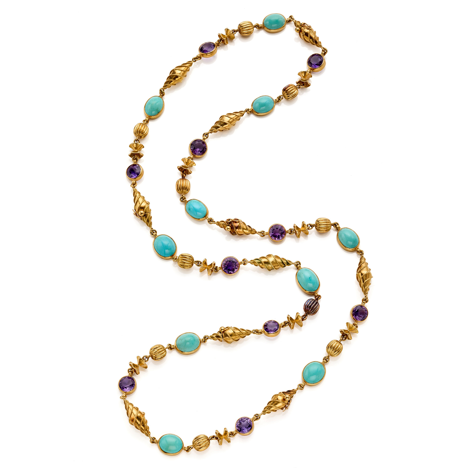 Cinque bracciali modulari Marchak unibili a collana in oro giallo 18 Kt con turchesi ovali cabochon per complessivi circa 69,65 ct e ametiste rotonde per complessivi circa 27,55 ct.