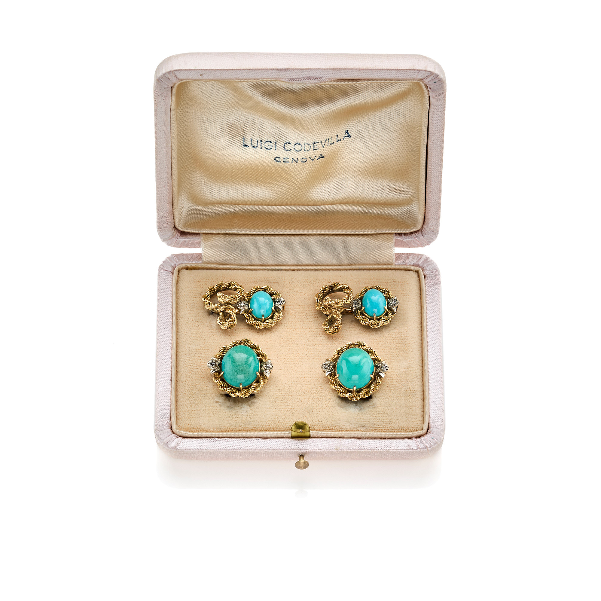 Lotto composto da gemelli e orecchini in oro giallo 18 Kt con turchesi ovali cabochon per complessivi circa 13,50 ct, rifiniti con diamanti mezza rosetta. Corredati di scatola Codevilla Genova.