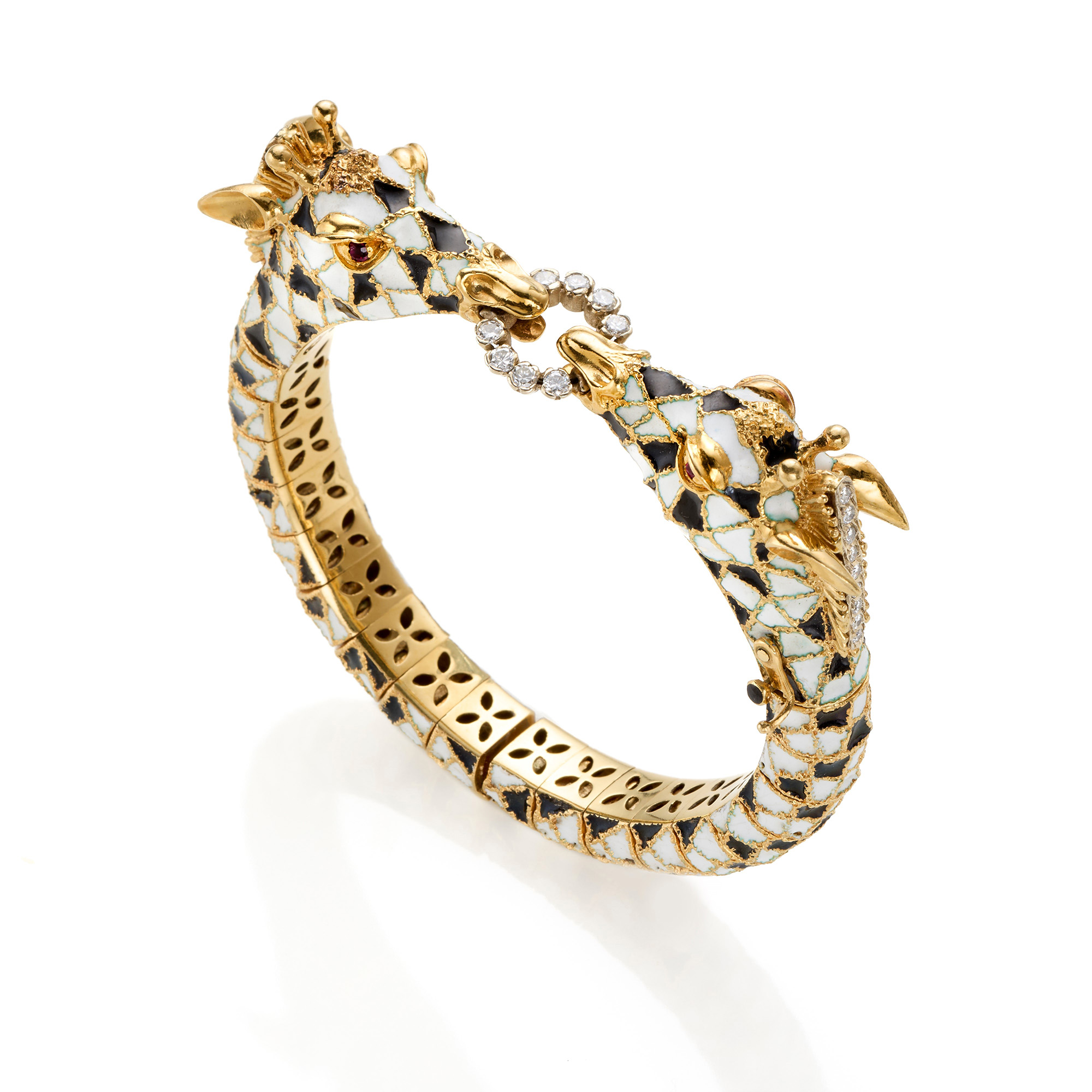 Bracciale rigido Frascarolo a guisa di giraffa in oro giallo e bianco 18 Kt decorato con smalti e rifinito con diamanti rotondi per complessivi ct. 0,40 circa e due rubini per gli occhi.