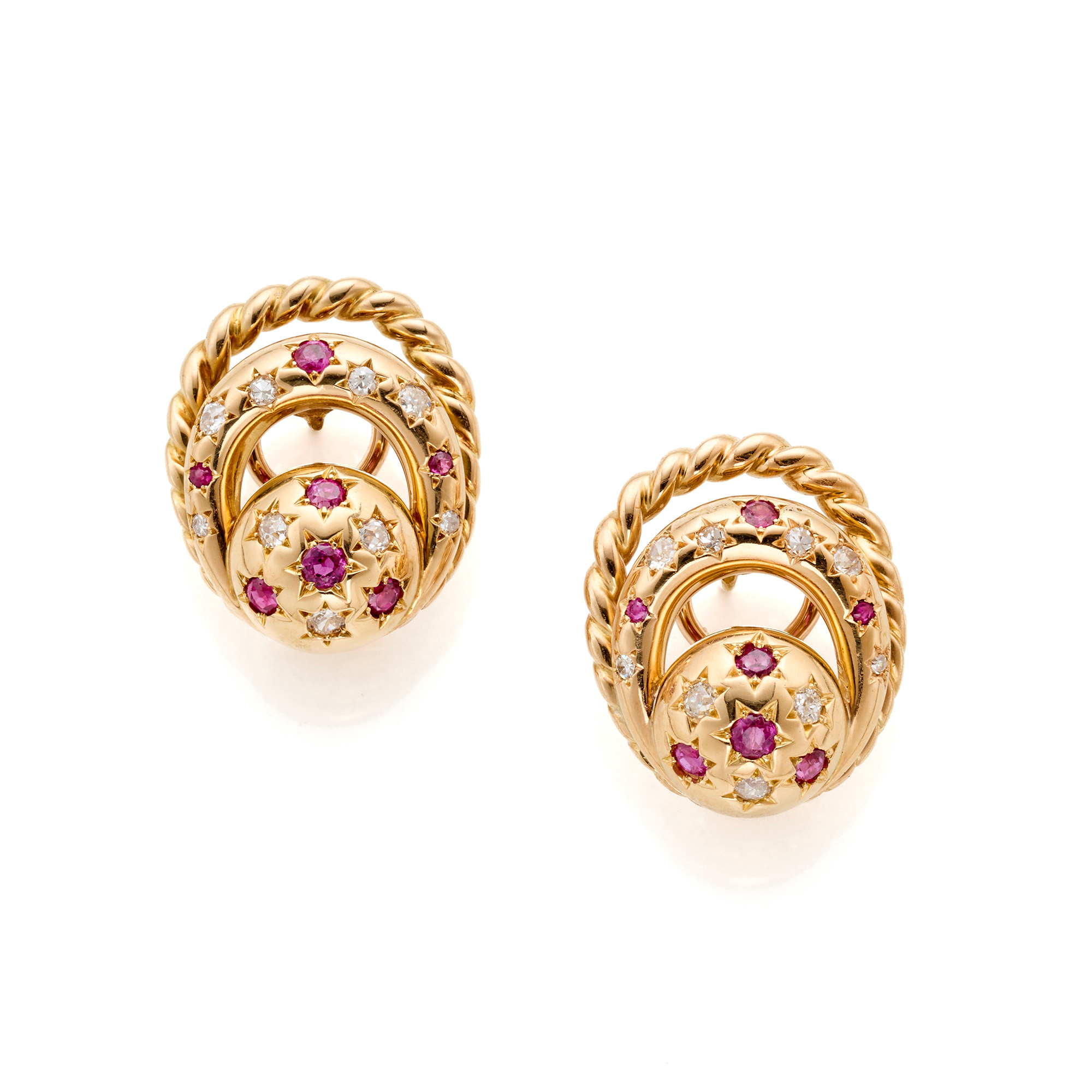 Orecchini in oro giallo 18 Kt rifiniti con diamanti rotondi per complessivi circa 0,45 ct ct e rubini rotondi per un totale di circa 0,80 ct.