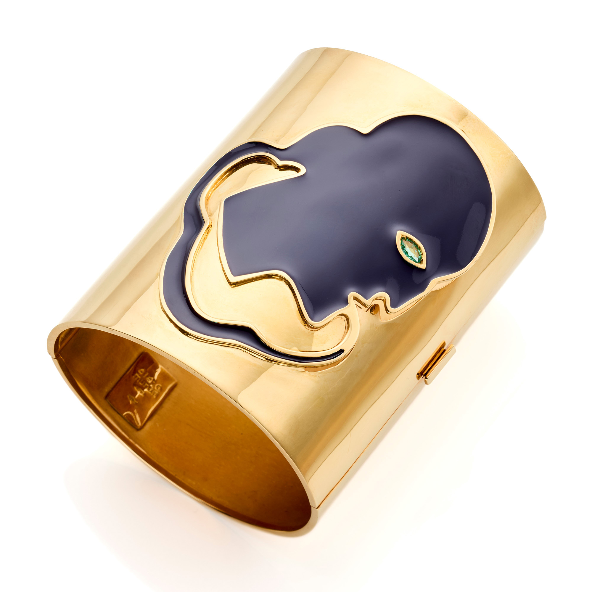*Bracciale manchette realizzato da Mimmo Paladino per Cleto Munari in oro giallo 18 Kt decorato da volto smaltato e rifinito con smeraldo marquise. Opera 9/9.