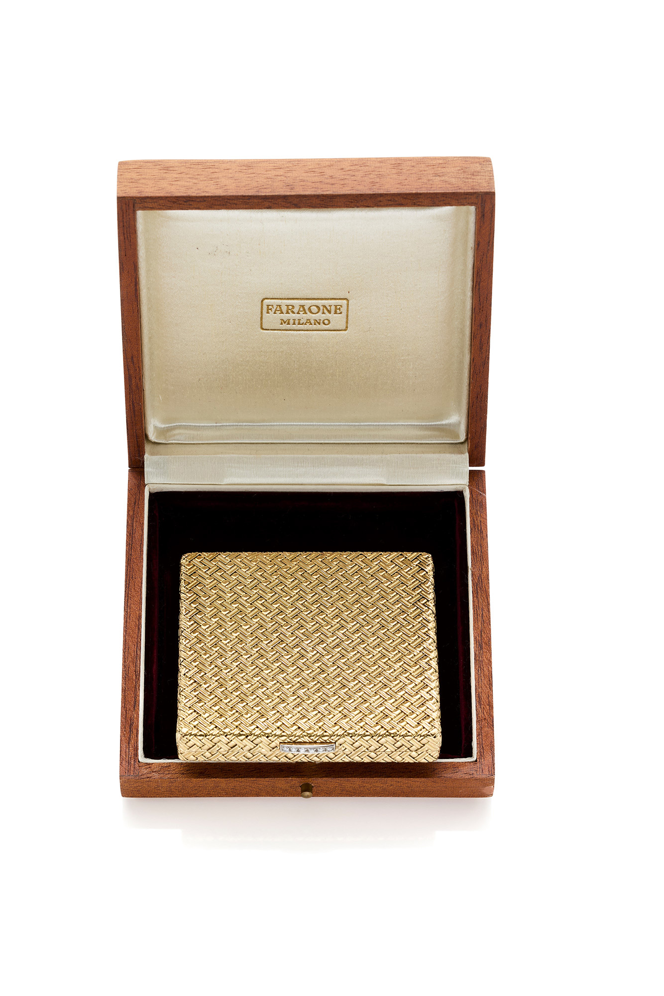 Illario 18 Kt yellow gold powder case decorated with round diamonds on the clasp, with mirror inside. Within a Faraone box.