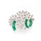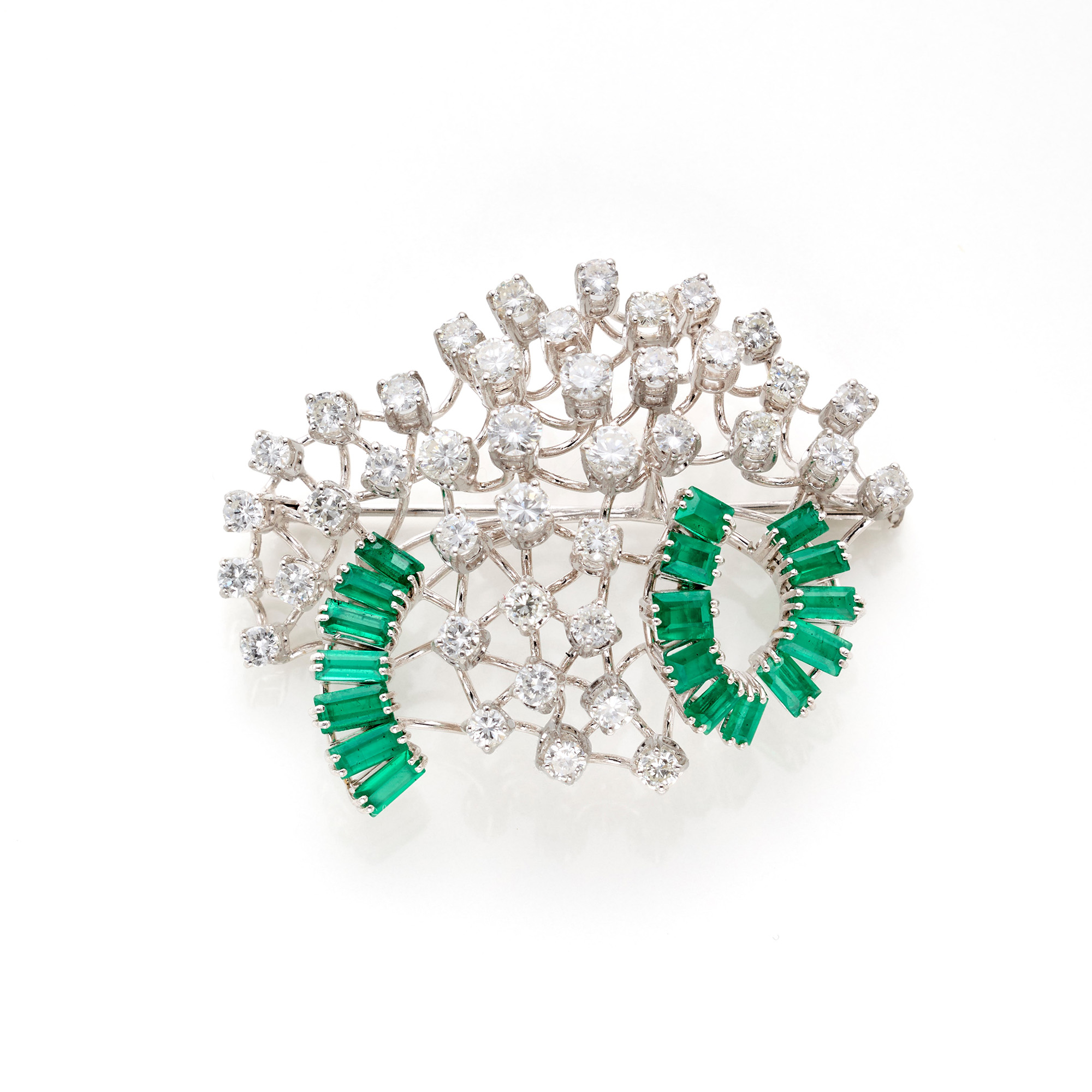 Spilla in oro bianco 18 Kt con diamanti rotondi per complessivi circa 2,80 ct e smeraldi baguette per un totale di circa 1,60 ct