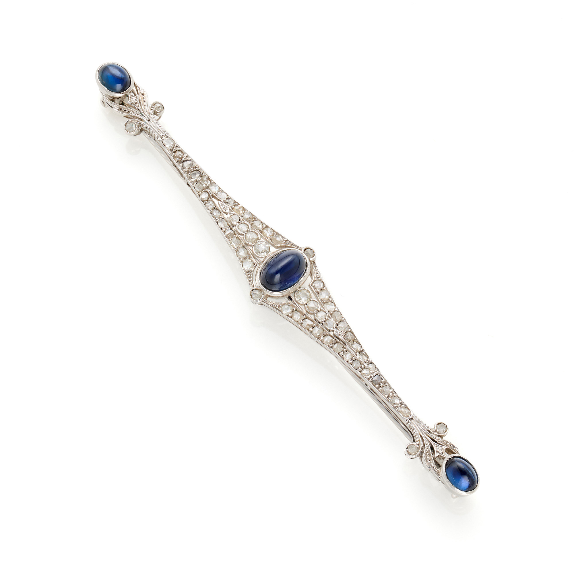 Spilla a barretta in oro bianco 18 Kt con diamanti mezza rosetta e zaffiri ovali cabochon per complessivi circa 2,50 ct.