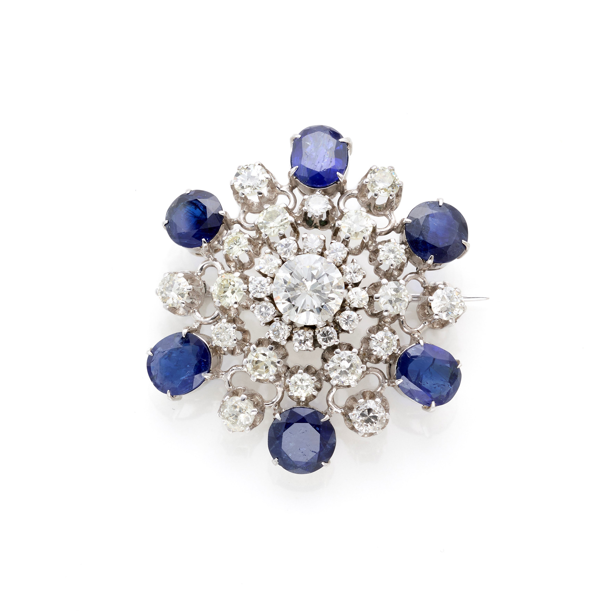 18 Kt white gold brooch/pendant with round diamonds totalling approx. 4,40 ct, the central one weighing approx. 1,60 ct and round and oval sapphires of approx. 7,30 ct overall.