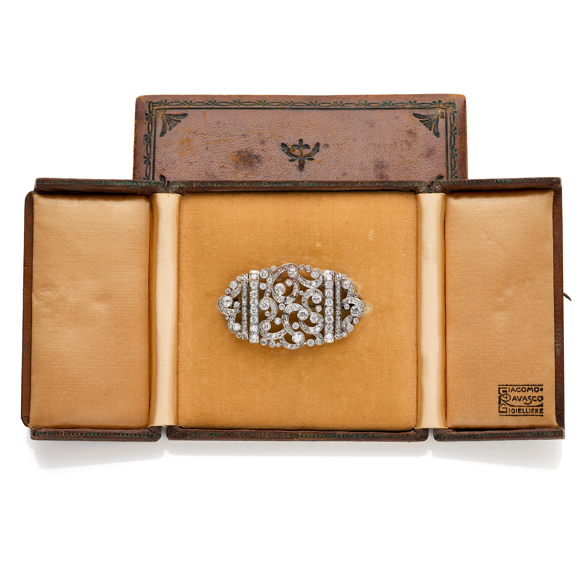Platinum brooch convertible into a pendant set with round old-cut diamonds and rose cut diamonds totalling approx. 2,80 ct. Complete with original Giacomo Ravasco cases and screwdriver.