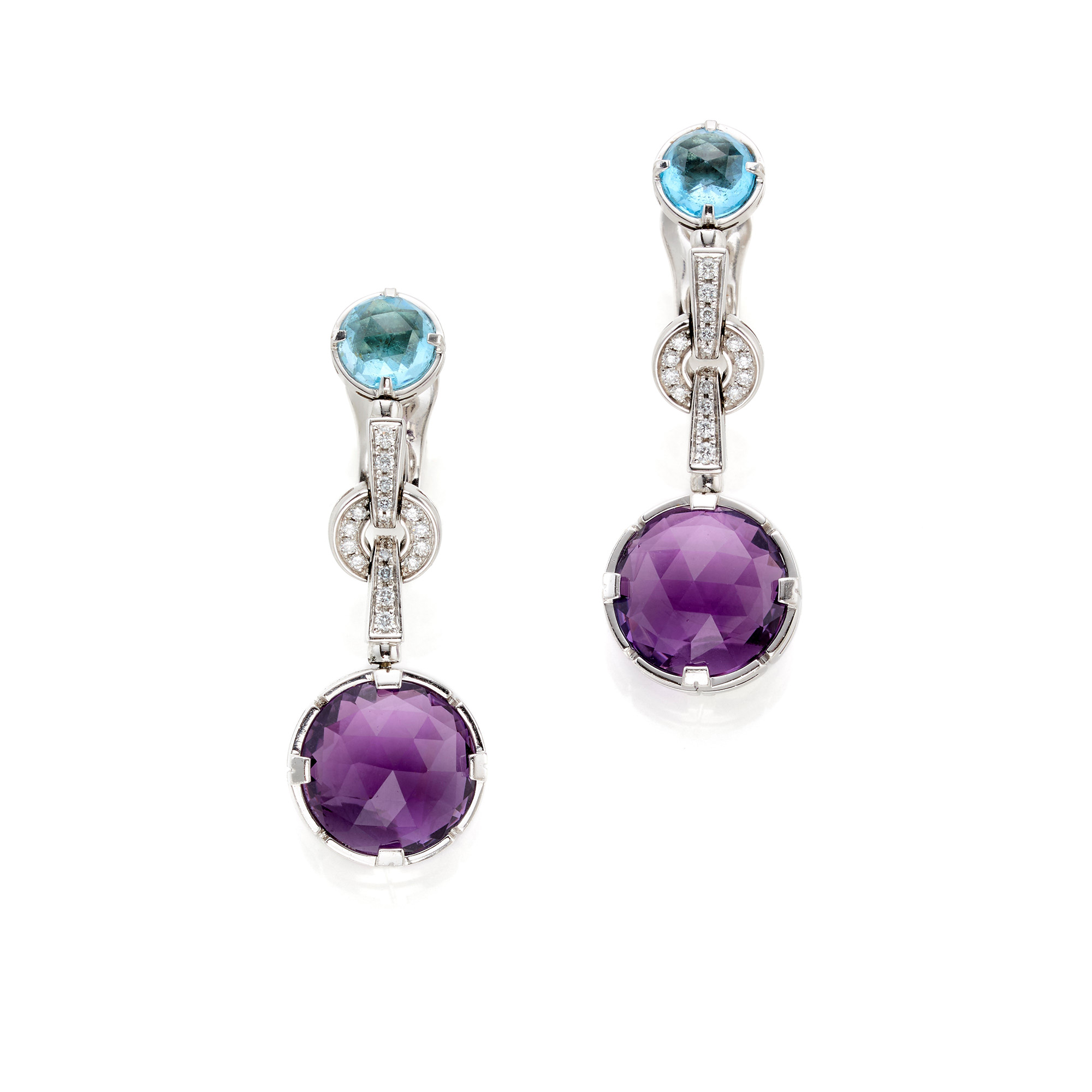 Bulgari Parentesi Cocktail earrings in 18 Kt white gold with round diamonds totalling approx. 0,25 ct and faceted round amethysts and topazes.