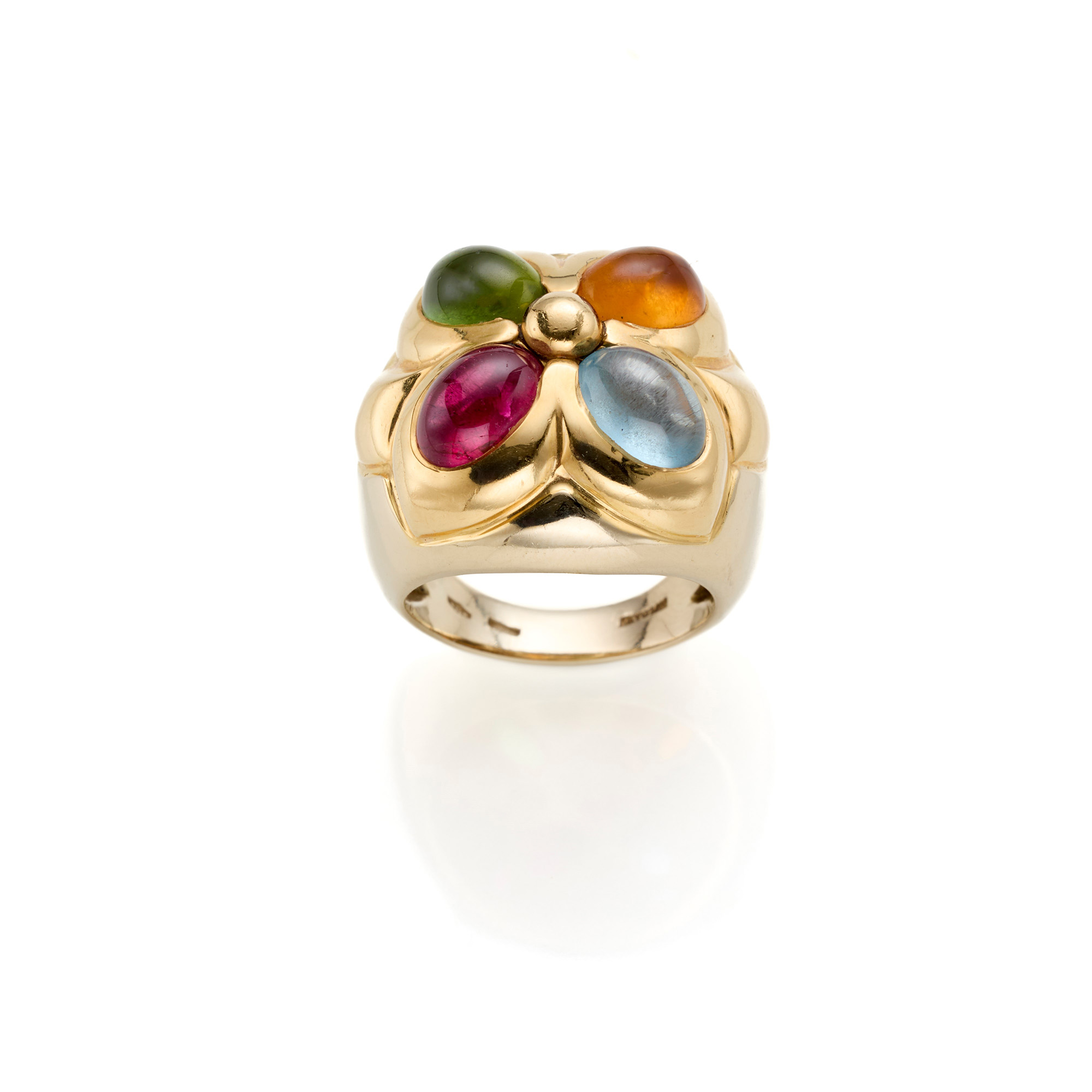 Bulgari 18 Kt yellow gold ring with cabochon quartz, aquamarine and tourmalines.