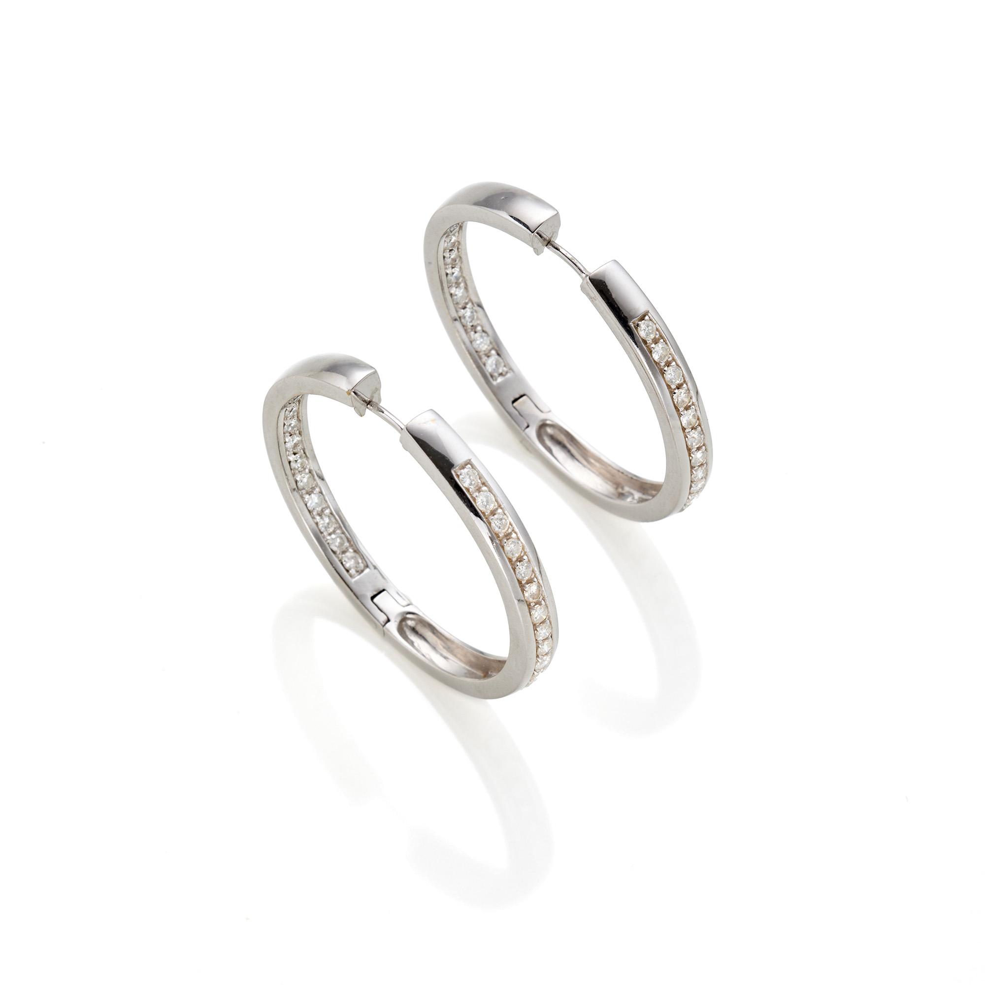 Orecchini a cerchio in oro bianco 18 Kt rifiniti con diamanti rotondi per complessivi circa 1,30 ct.