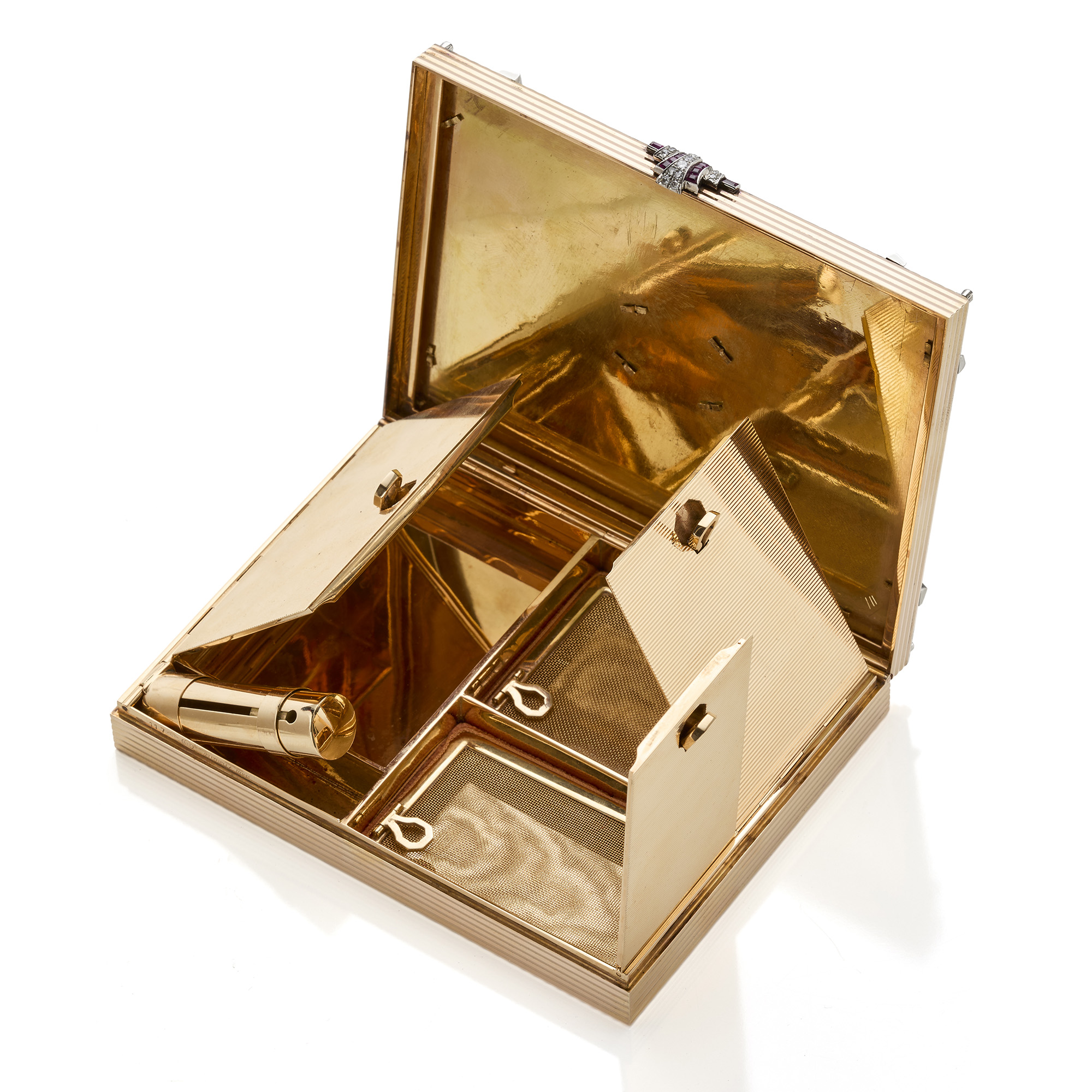 Minaudière Illario per Ventrella in oro giallo e bianco 18 Kt decorata da motivo rigato a cerchi concentrici rifinita con diamanti rotondi per complessivi circa 4 ct e rubini calibrè, all'interno tre scomparti e porta rossetto. Corredata di astuccio originale.