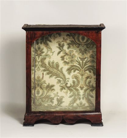 PICCOLA TECA IMPIALLACCIATA IN RADICA DI NOCE - SMALL BURR WALNUT CABINET cappello modanato, fronte con vetrina, sportello al verso, pendaglina mossa, piedi a cornice h cm 39,5x32,5x14,5