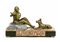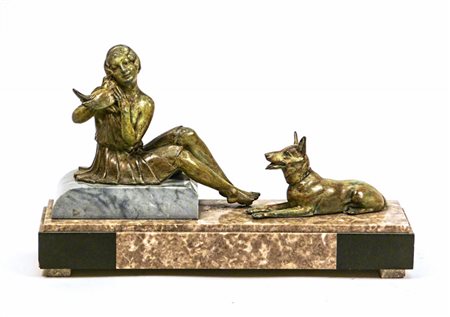 GRUPPO IN METALLO PATINATO - PATINATED METAL FIGURAL GROUP periodo Art Déco - Art Deco period raffigurante una fanciulla con colomba e cane, base in marmo h cm 24x39x11