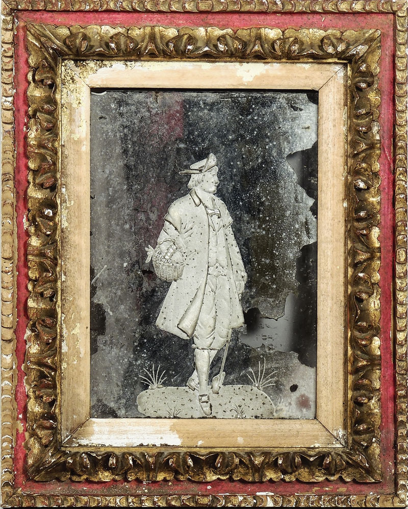 PANNELLO DECORATIVO IN SPECCHIO Venezia - Venice, XIX secolo - 19th Century molato con figura di gentiluomo, in cornice, difetti cm 27x19,5