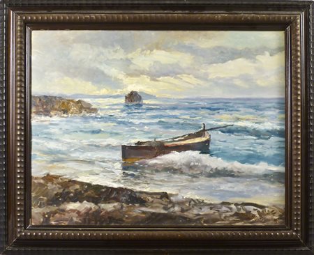MARINA CON SCOGLIERA E BARCA - SEASCAPE WITH ROCKS AND BOAT olio su tavoletta - oil on panel, firmato G. Brandizio, in cornice cm 59x68