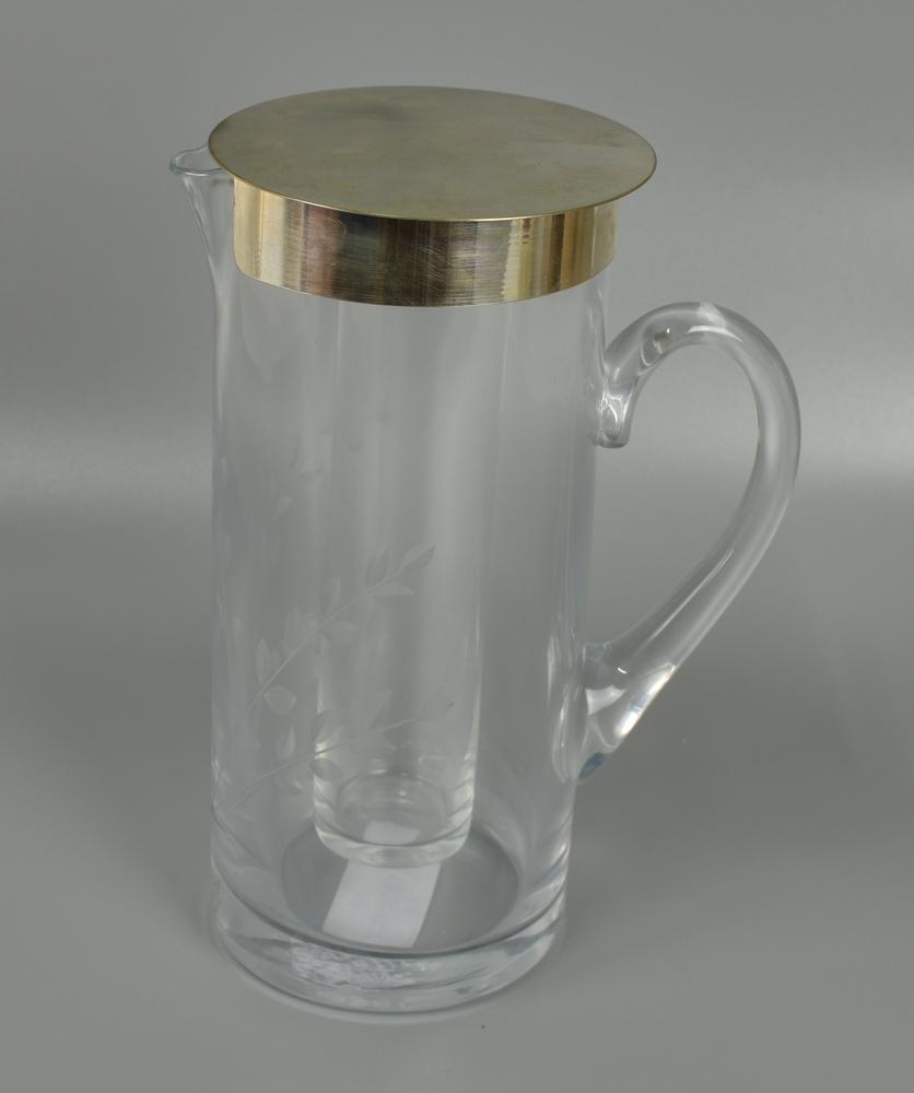 caraffa in cristallo con contenitore per ghiaccio, tappo in metallo argenato, h. 25cm
