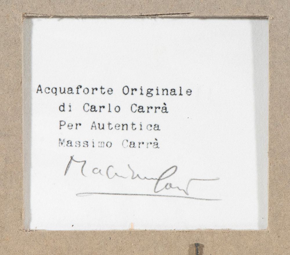 Firma incisa sulla lastra in basso a destra: C. Carrà; titolo, anno e tiratura a matita: La Nascita di Venere, 1923 27/60. Timbro dello Studio Carrà, Milano in basso a destra. Al retro dichiarazione di autenticità di Massimo Carrà