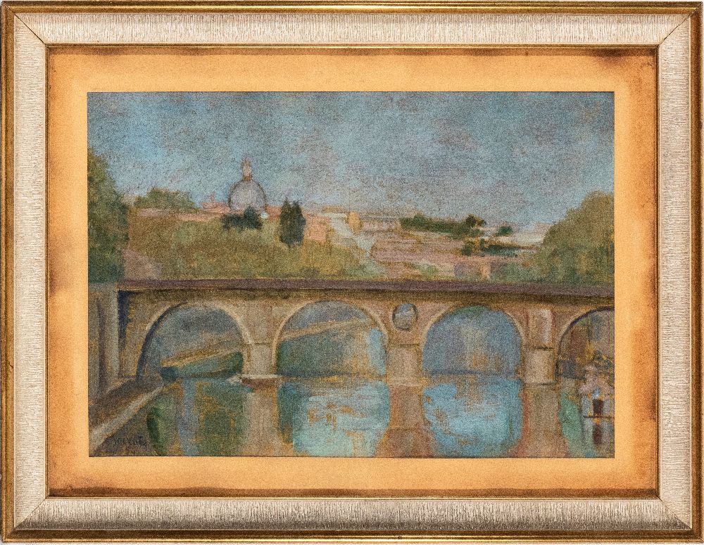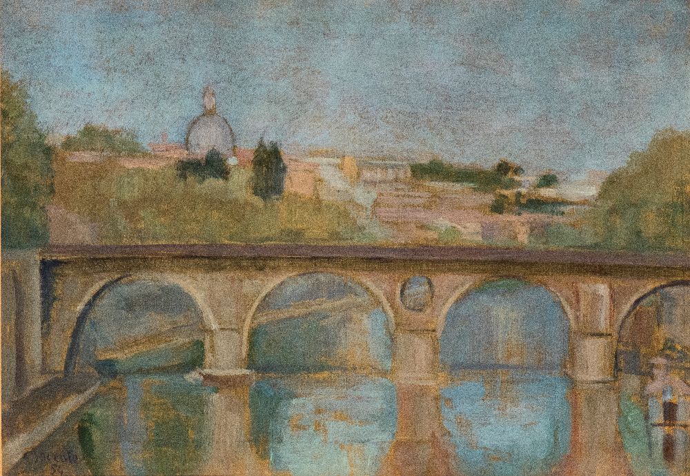 CARLO SOCRATE (Mezzanabigli 1889-Roma 1967), Veduta di Ponte Sisto e della cupola di San Pietro, 1954