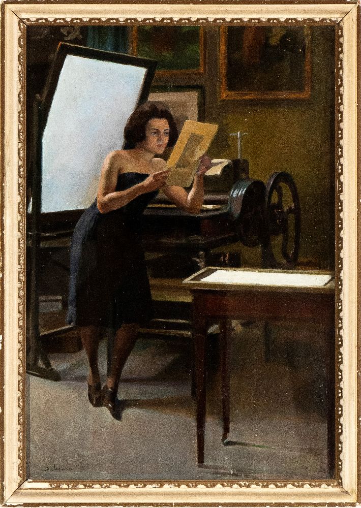 EMILIO SOBRERO (Torino 1890-Roma 1964), Donna che guarda delle stampe