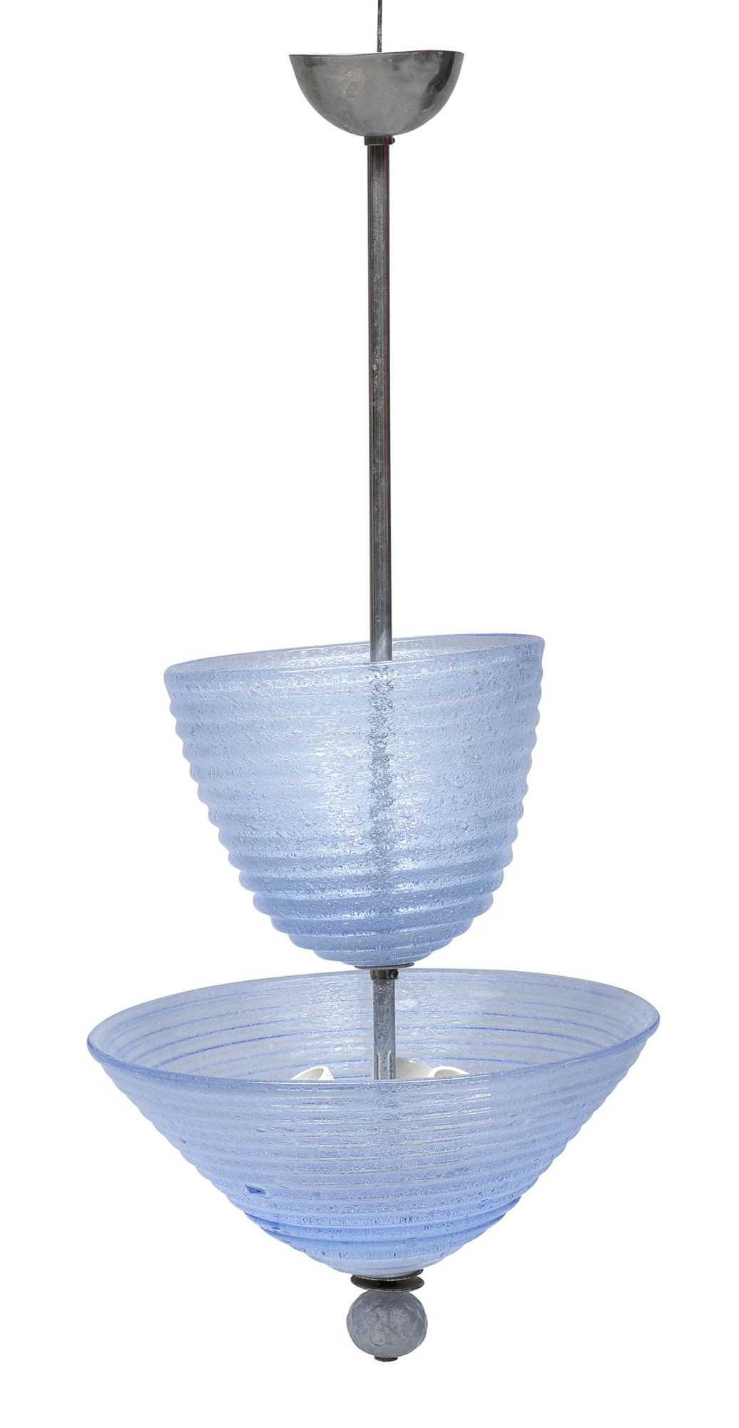 in vetro puligoso a fondo azzurrino e doppia coppa sovrapposta con rudentature circolari.