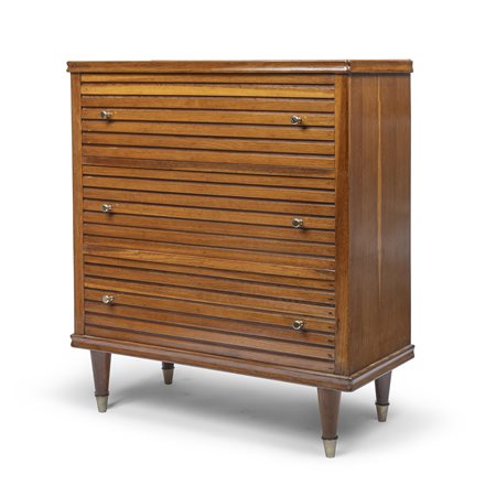 a tre cassetti con grissinatura in legno impiallacciato e pomelli in ottone dorato.