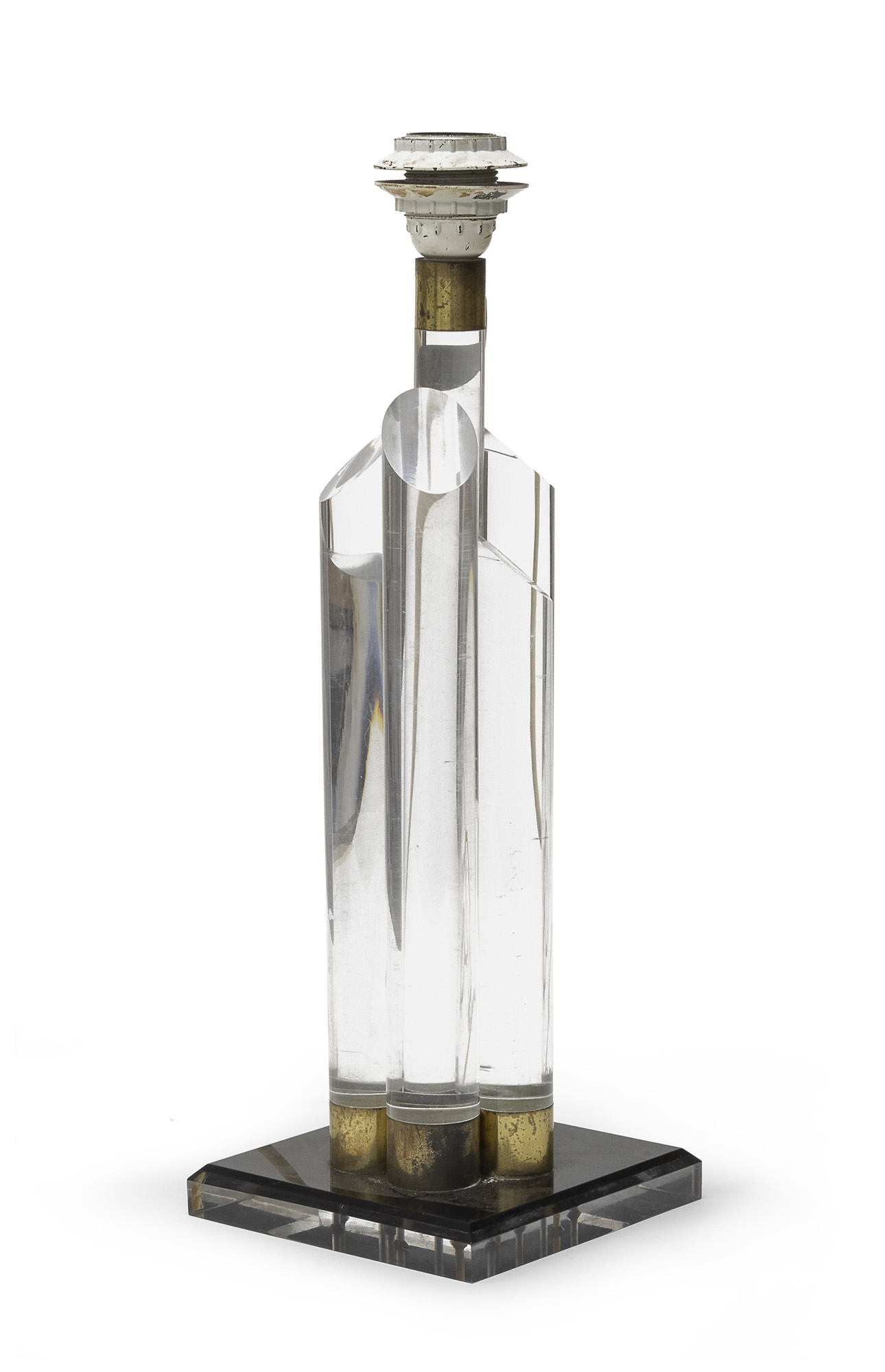 con sei cilindri in plexiglass e fusto in plexiglass, in ottone. Base in plexiglass nero.
