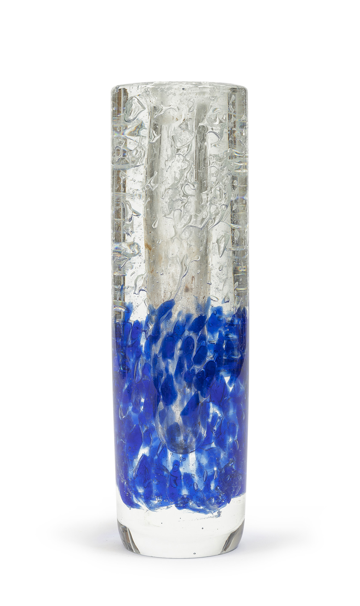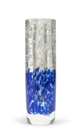 in vetro sommerso incolore con inclusioni a bolle e in blu.