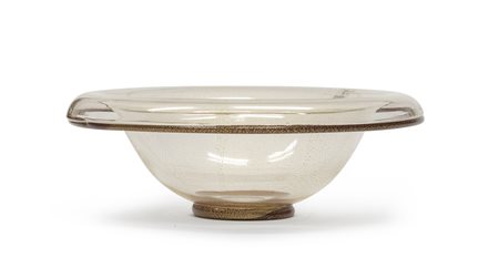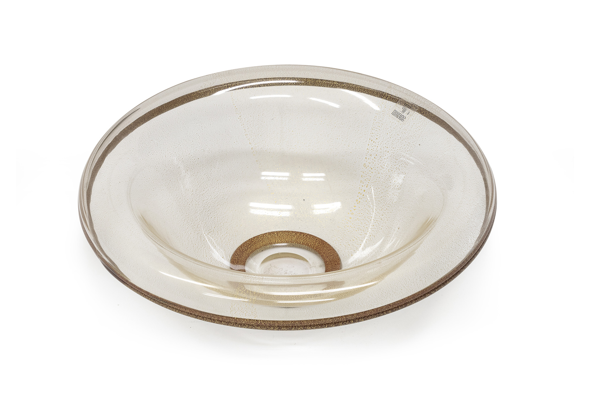 in vetro trasparente con inclusioni in avventurina. Bordo e piede in pasta di vetro rosso mattone.