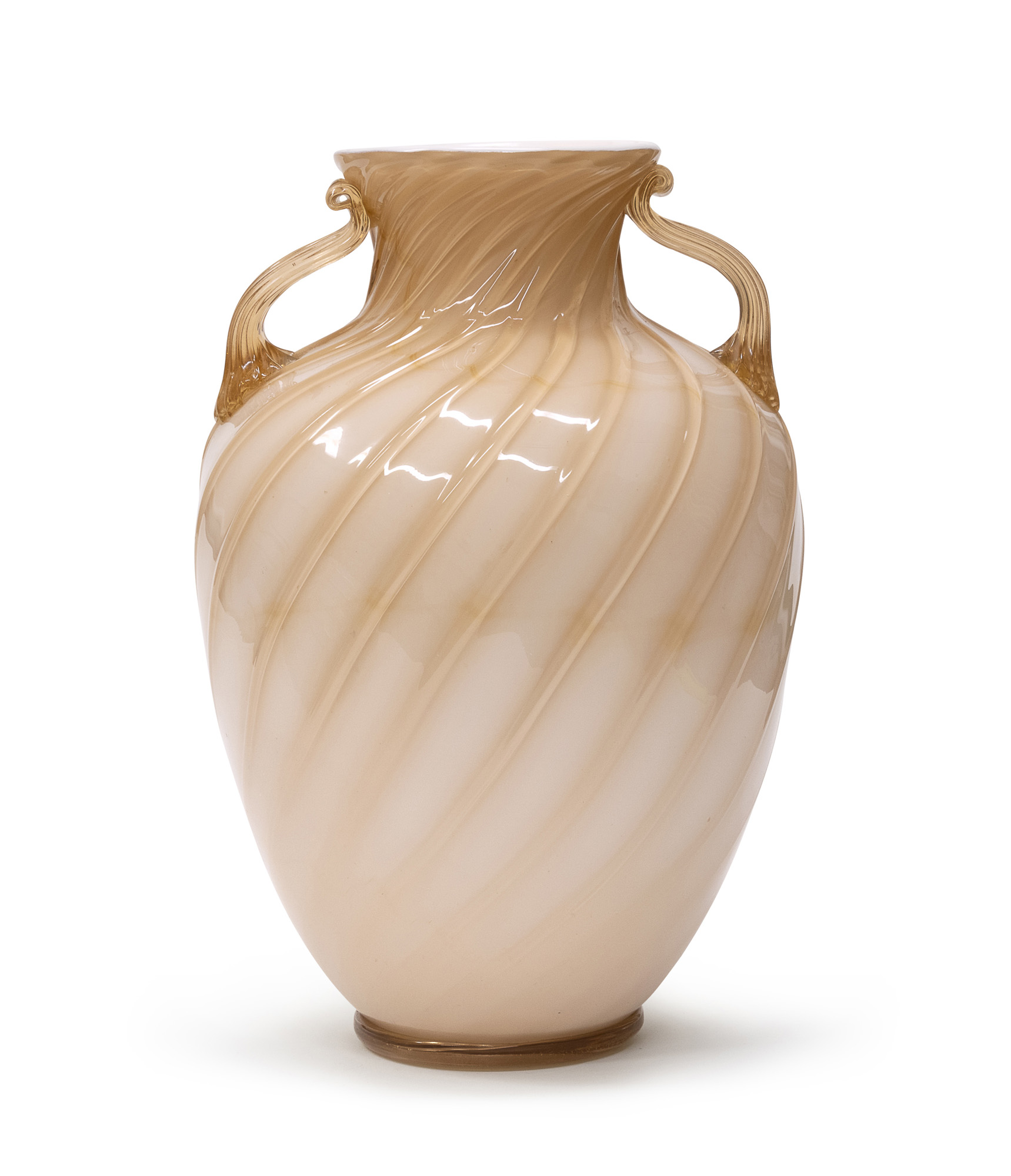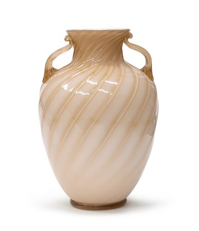 in vetro incamiciato lattimo e rosa con costolature a spirale. Anse applicate a caldo e piede in vetro rosa trasparente con inclusioni di avventurina.