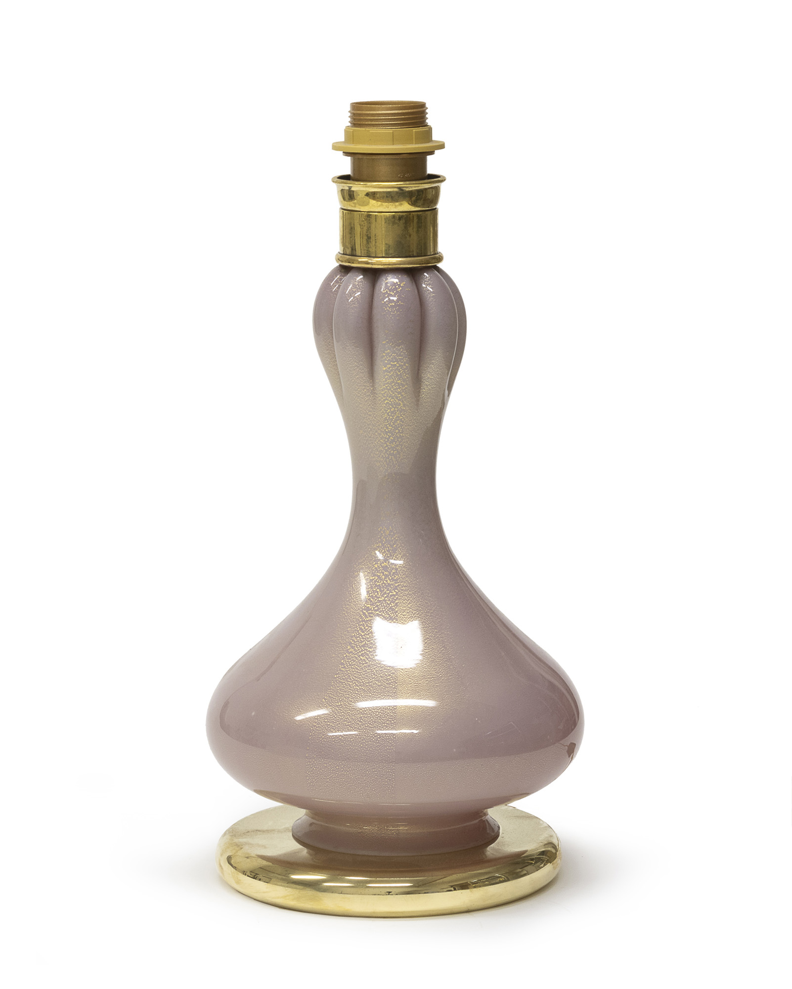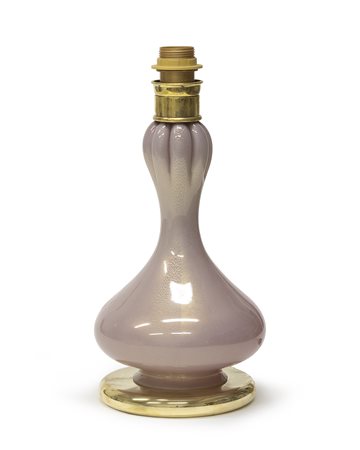 soffiato e incamiciato, otticamente rigato, trasparente e rosa opalino con inclusioni in avventurina. Corpo a forma a zucca ed elementi in ottone dorato, piede circolare.