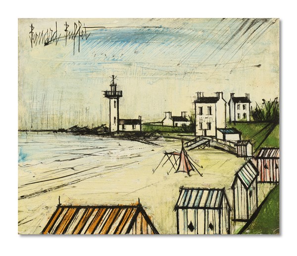 Bernard Buffet "Plage et phare" 1969 olio su isorel cm 22x27 Firmato in alto a s