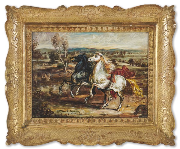 Giorgio De Chirico "Due cavalli in un paese" 1954 olio su tela cm 30x40 Proveni