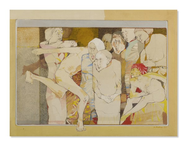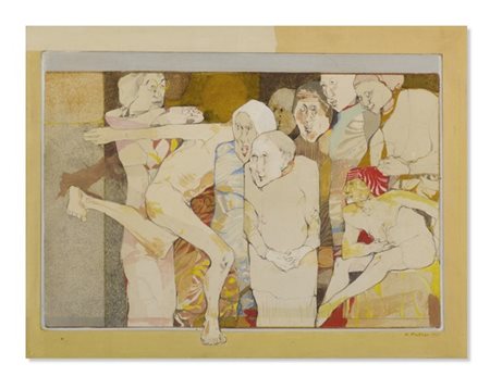 Karl Plattner "Il matriarcato" 1969 tempera su carta su tavola cm 44x58 Firmato