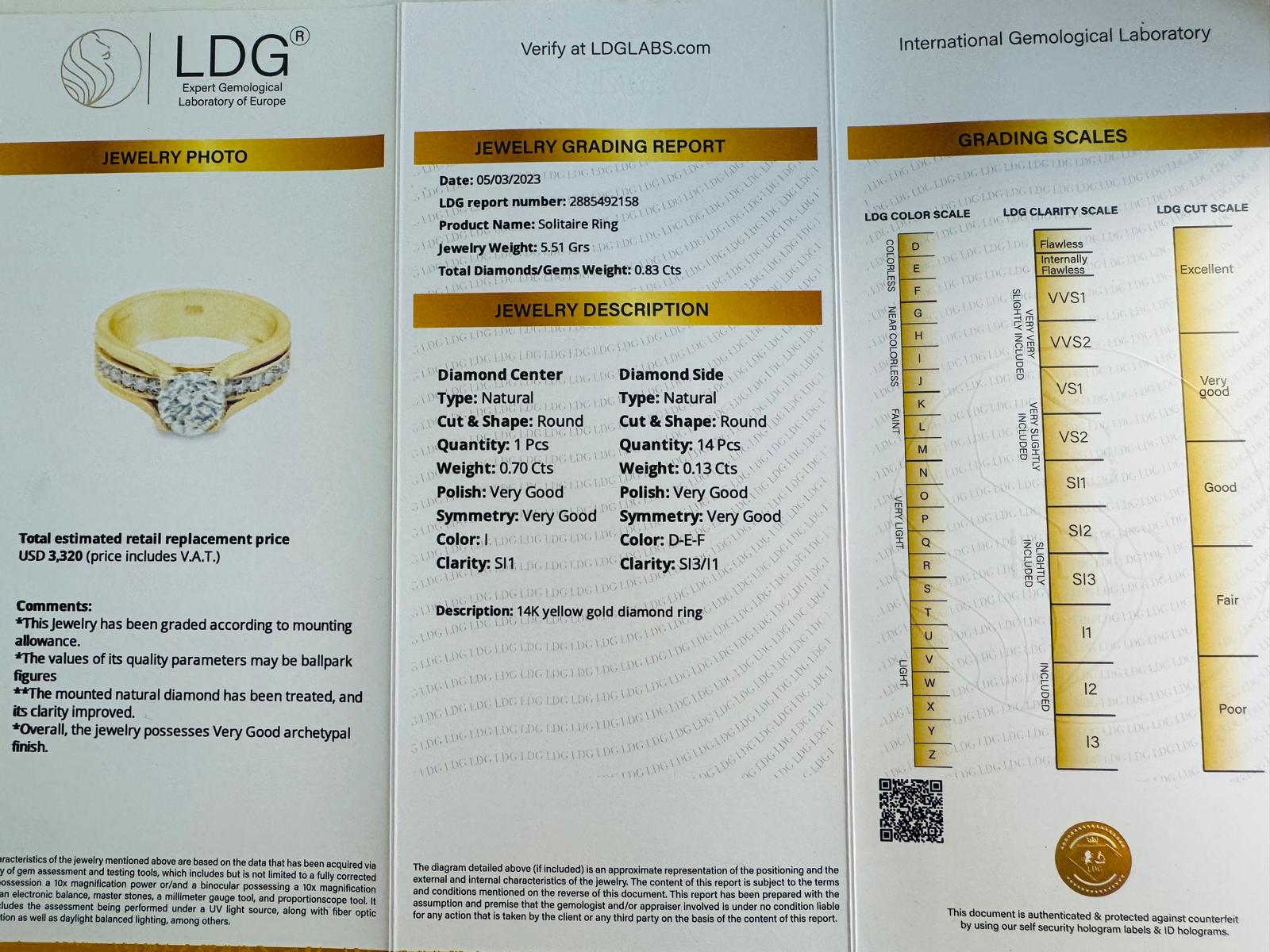 ANELLO IN ORO GIALLO 14k - 5.51 GR CON DIAMANTI: PEITRA CENTRALE BRILLANTE COLORE I PUREZZA SI1 DA 0.70 CT *PUREZZA ESALTATA* BRILLANTI LATERALI D-F SI-I1 14-0.13 CTBR D-F SI-I1 14-0.13 CT TAGLIA: 5 CERTIFICATO LD GR - DH-R433 - DH-R433