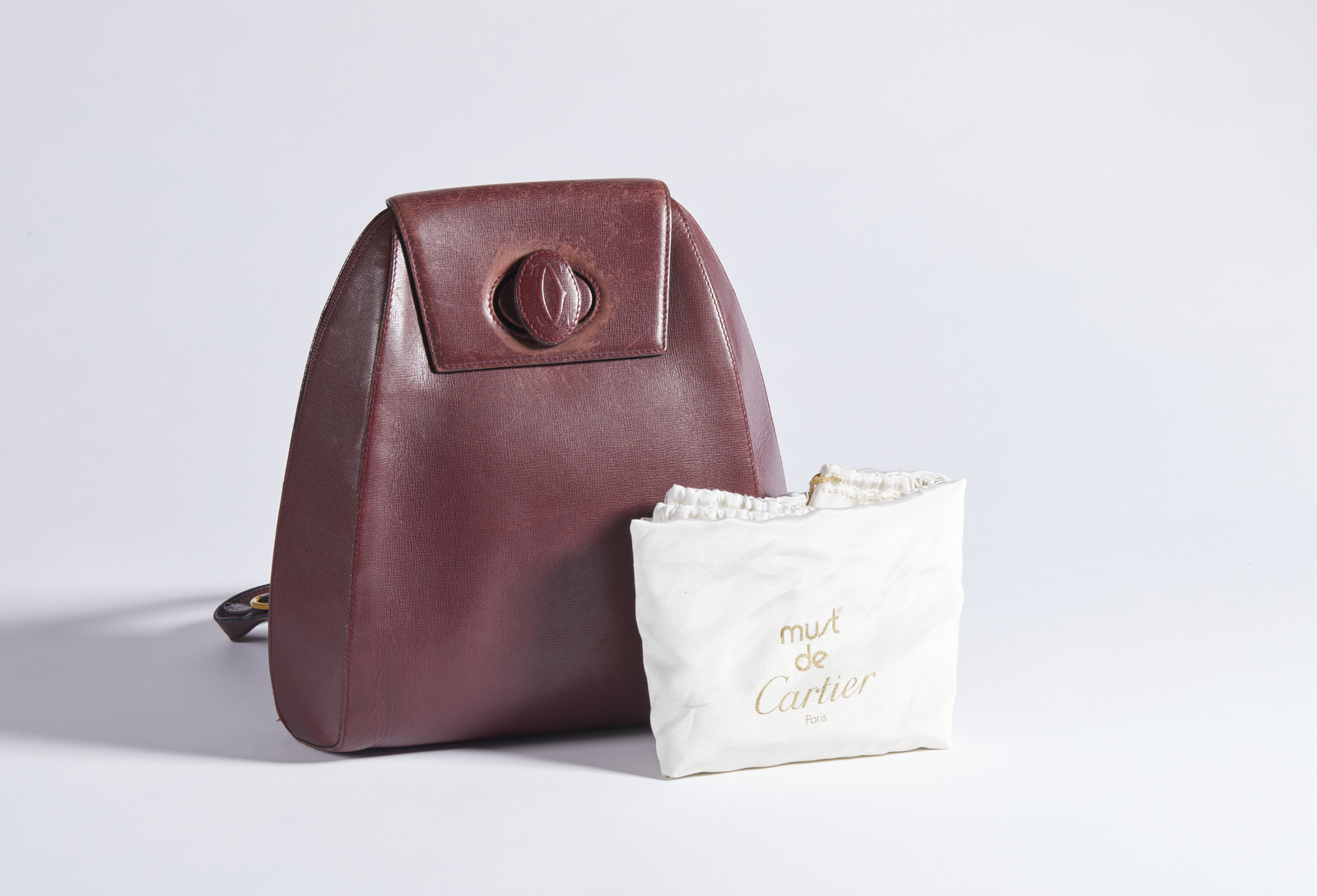 CARTIER Zaino. Pelle. . Zaino in pelle rosso con logo, chiusura zip e ad incastro, interno in tela monogram, tasca piatta con chiusura a zip, hardware color oro.