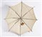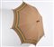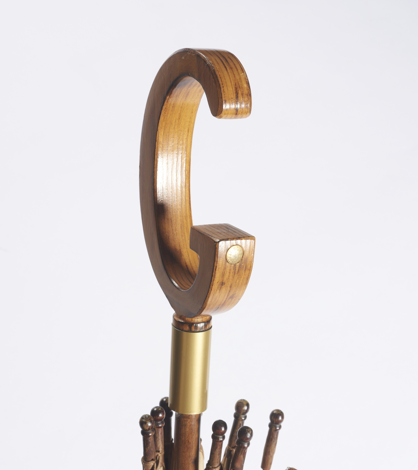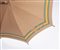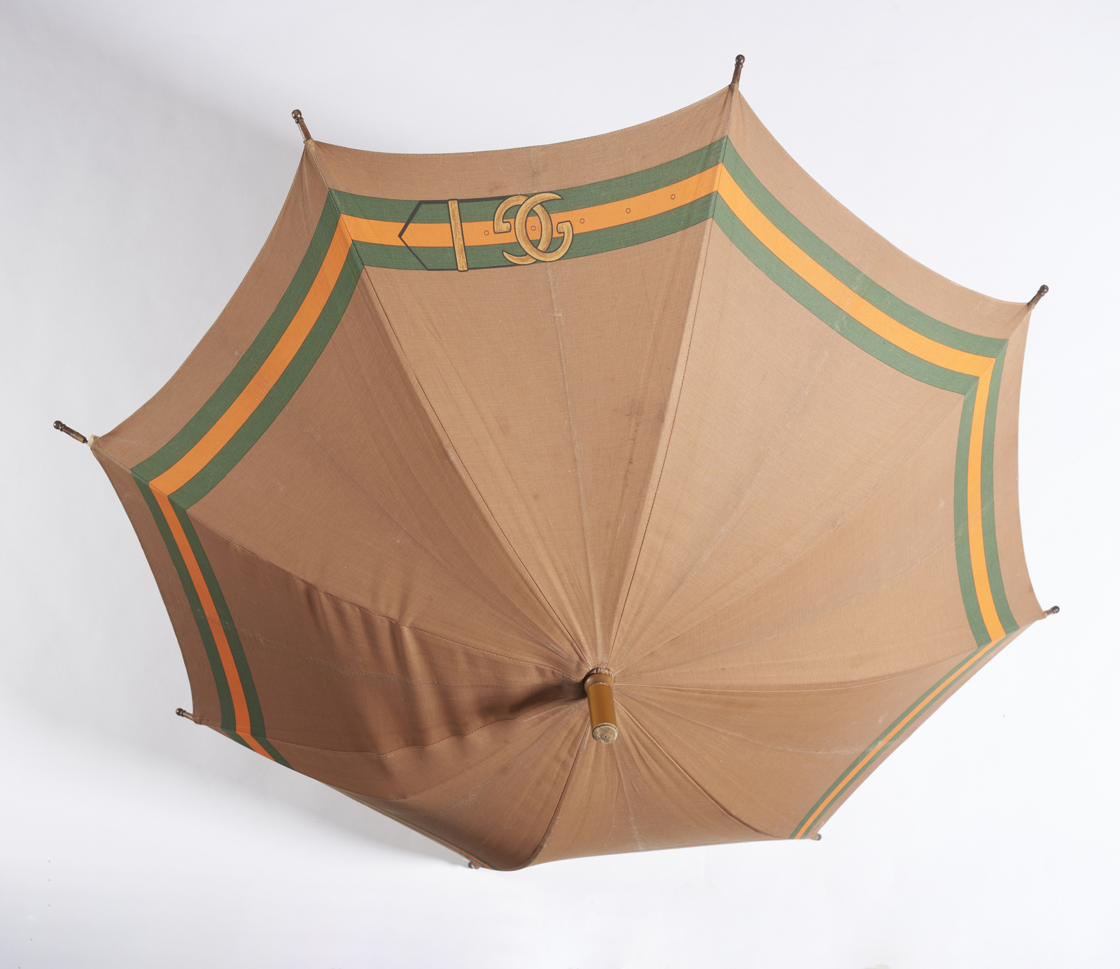 GUCCI Ombrello . Tela. . Ombrello con impugnatura in legno e riproduzione della G di Gucci, asta interna in legno, bacchette e relativa forcelle in metallo. La stoffa dell'ombrello è di colore marrone con strisce decorative verdi e arancioni e l'iconico marchio Gucci. Diametro 97 cm