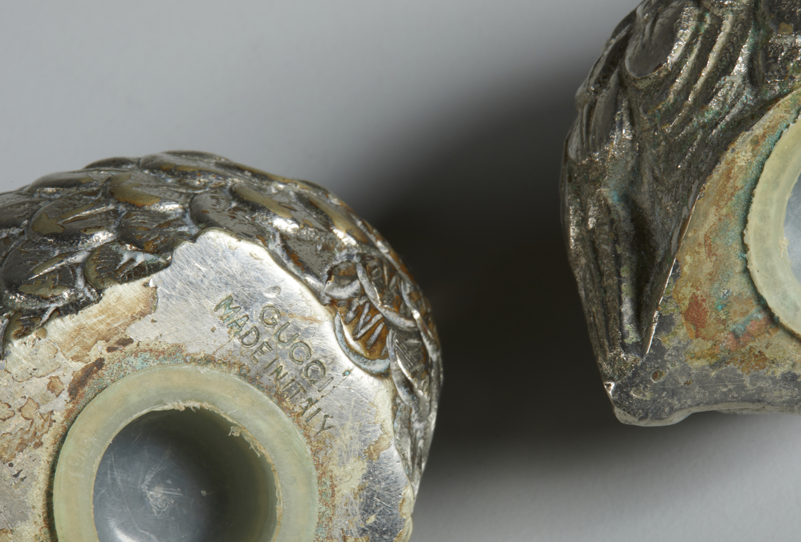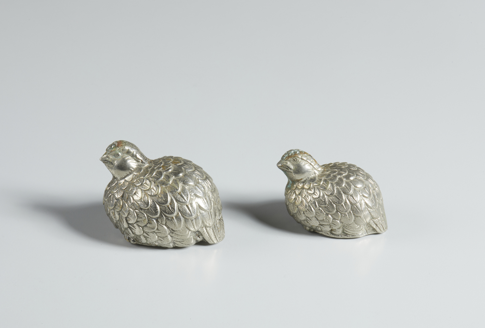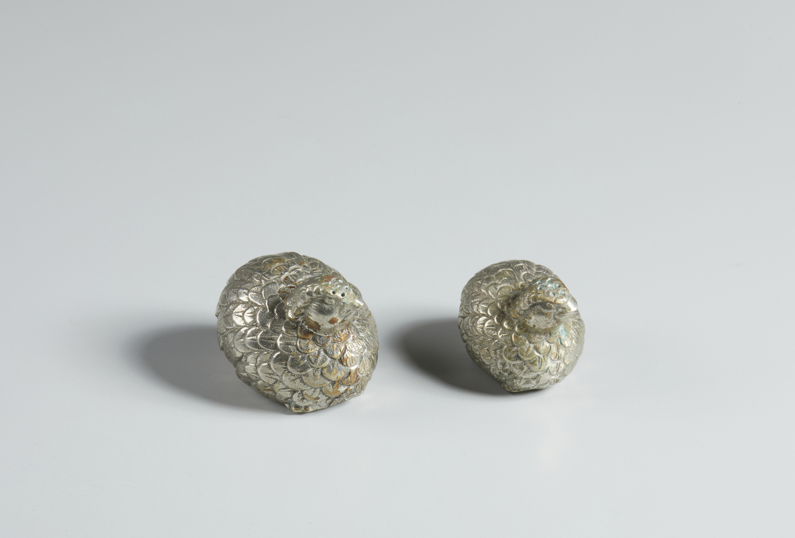 GUCCI Saliera e pepiera in ottone argentato. Ottone argentato.. . Saliera e pepiera Gucci in ottone argentato a forma di volatile.