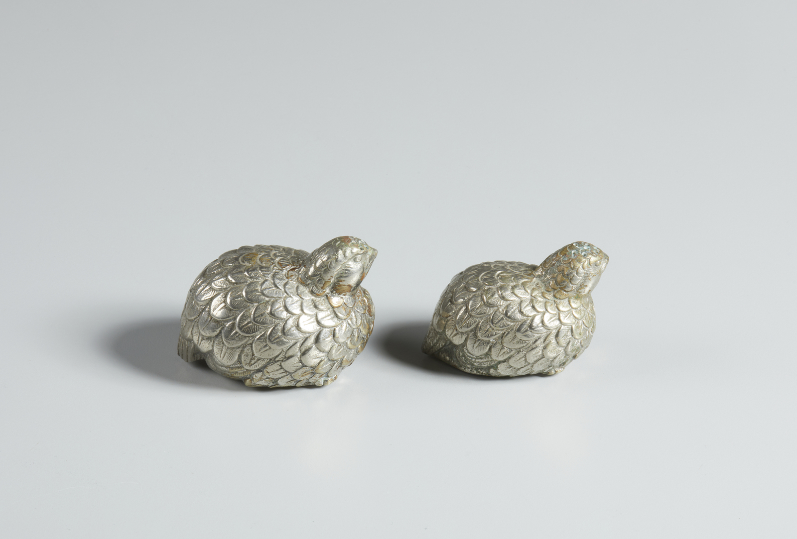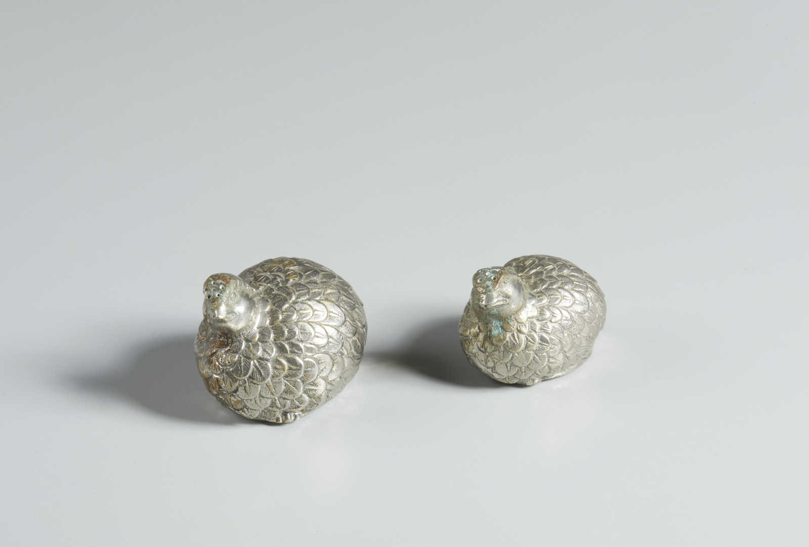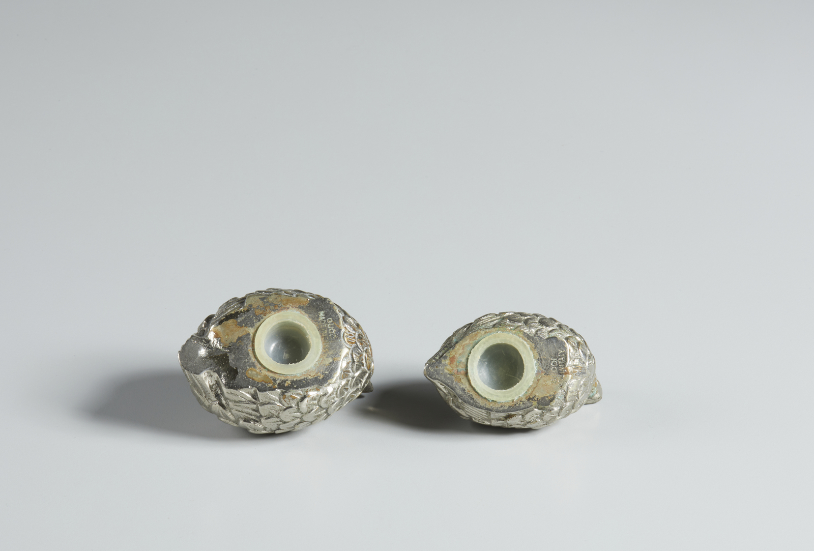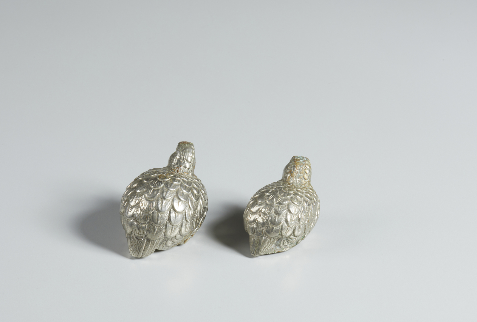 GUCCI Saliera e pepiera in ottone argentato. Ottone argentato.. . Saliera e pepiera Gucci in ottone argentato a forma di volatile.