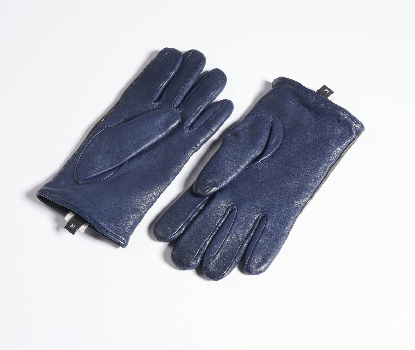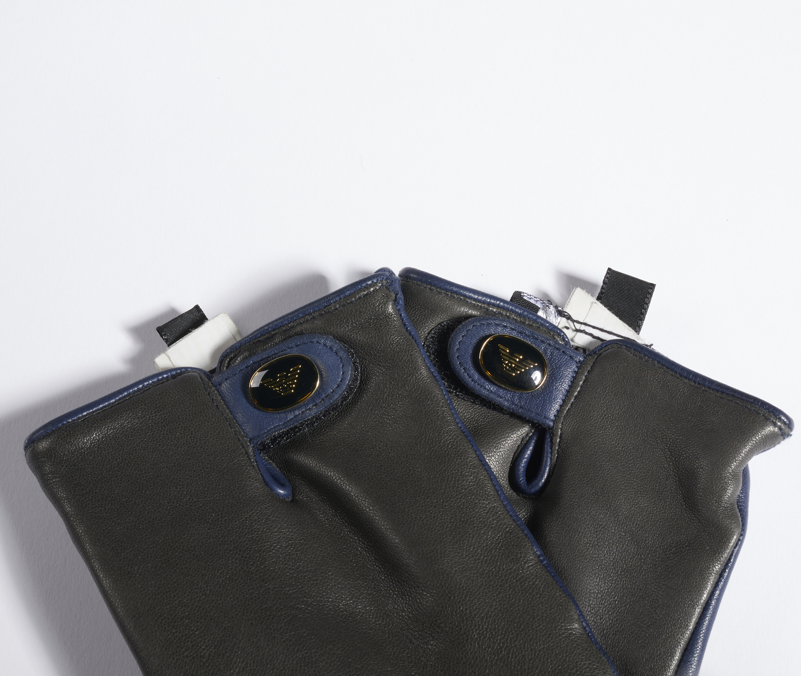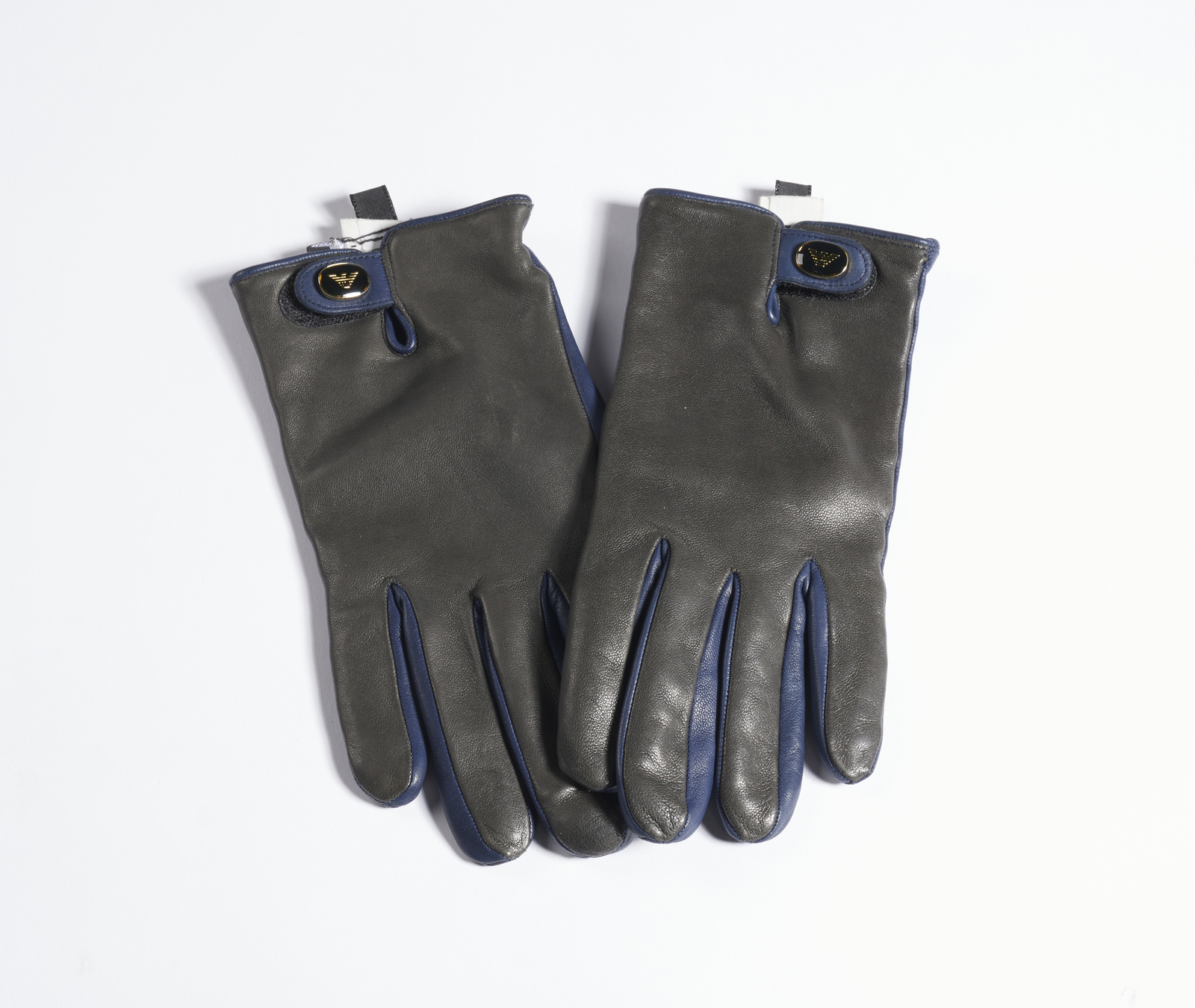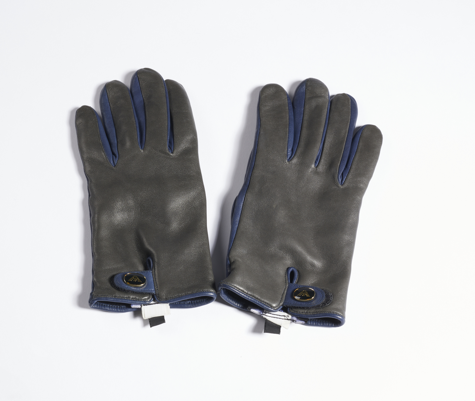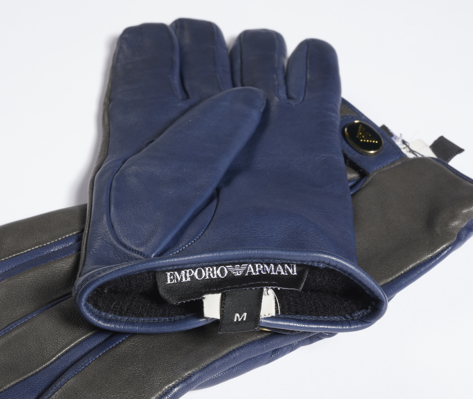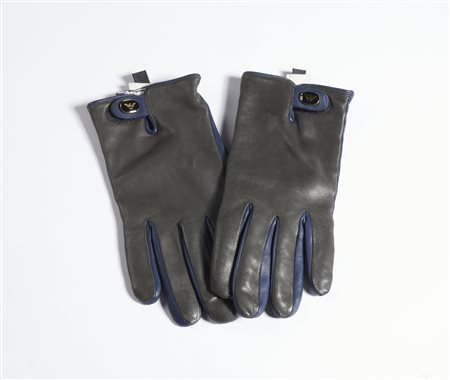 GIORGIO ARMANI (n. 1934) Guanti. Pelle. Cm 8,50 x 21,00. Guanti in pelle doppio colore blu e nero, logo Armani sul dorso, interno in lana. Taglia M.