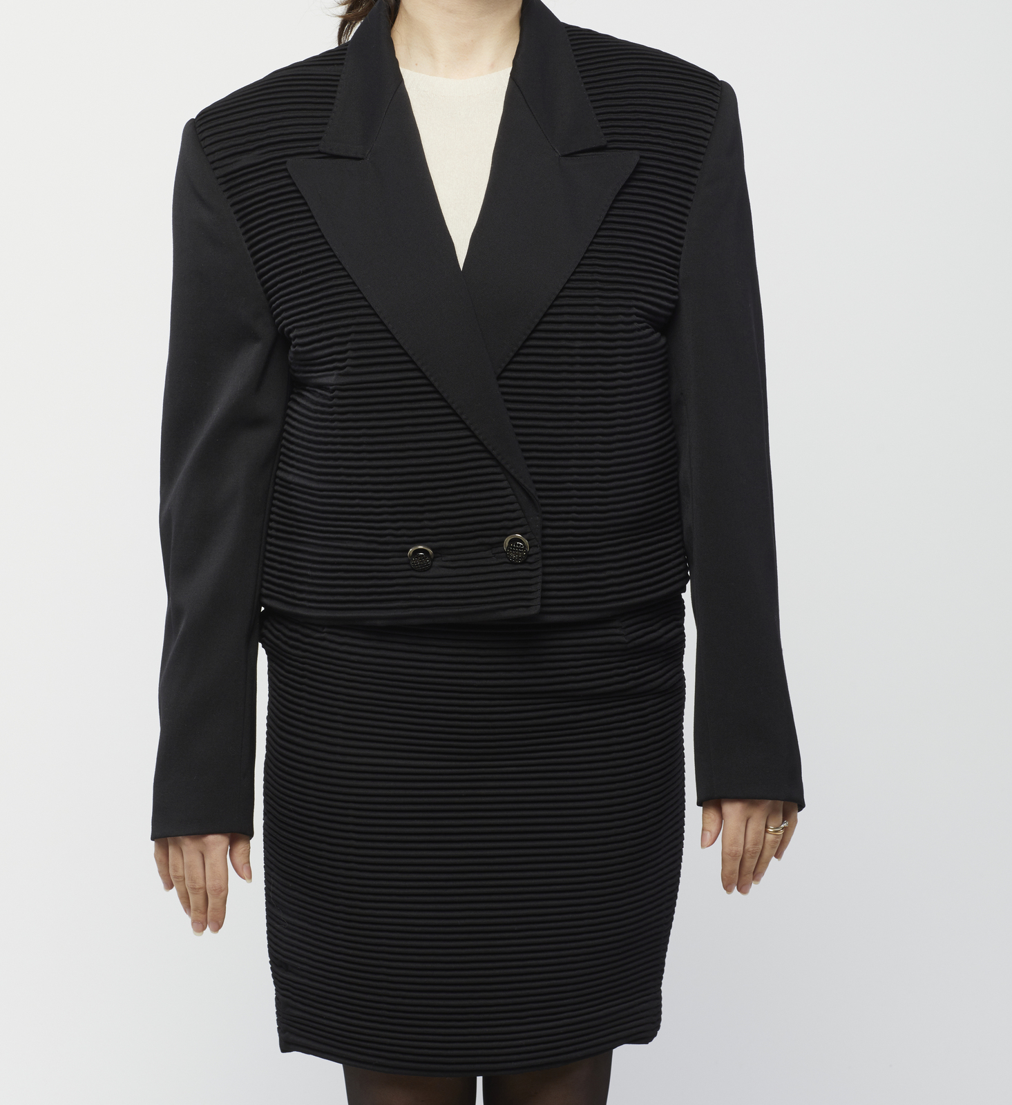 VERSACE GIANNI (1946 - 1997) Tailleur nero. 1990. lana. . Tailleur Gianni Versace vintage, Taglia IT 42. Etichetta presente all'interno. Composto da giacca a doppio petto con due bottoni gioiello in tessuto nero operato, con revers e maniche lunghe in tessuto liscio a contrasto; gonna in tessuto operato nero. Giacca lunga 50 cm, spalla 42. Inizio anni '90.