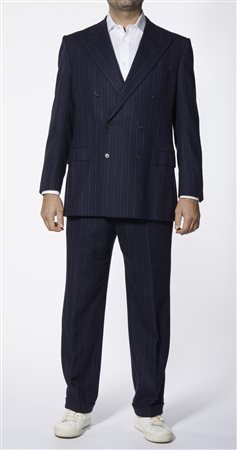 BATTISTONI Completo da uomo doppio petto. lana. . Giacca e pantaloni di colore blu con motivo gessato.