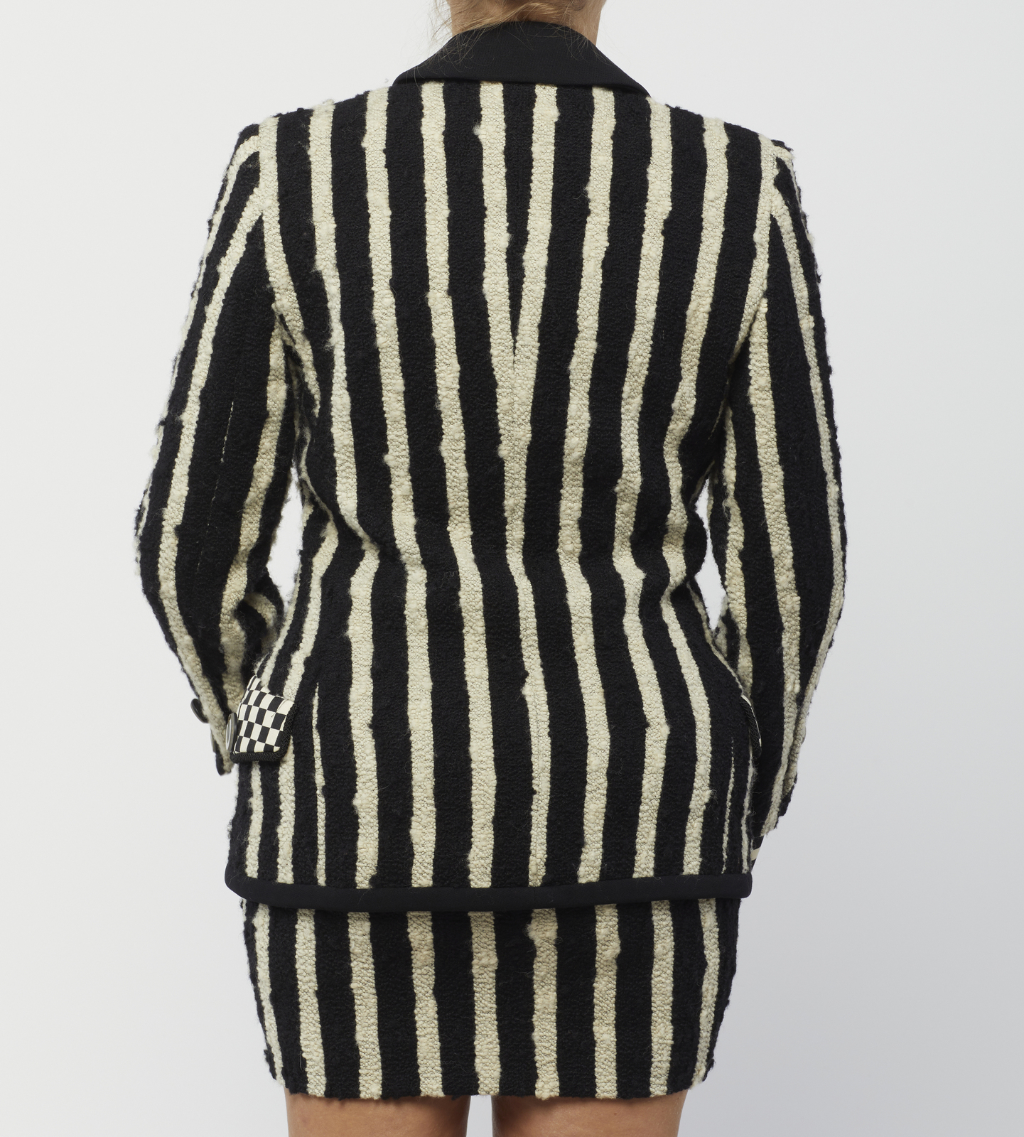 VERSACE GIANNI (1946 - 1997) Tailleur a righe avorio e nero. 1990. lana. . Tailleur Gianni Versace Couture vintage, composto da giacca e mini gonna. Giacca in tessuto in lana operata bouclée a righe verticali bianca avorio e nera, polsini interni e taschine in tessuto a scacchi bianco e nero. Chiusura con quattro bottoni, piccolo collo in tessuto nero. Bottoni logo con greca. Minigonna in tessuto bouclé bianco avorio e nero coordinato alla giacca. Taglia 40 It. Lunghezza gonna 42 cm. Etichetta Gianni Versace Couture, prima metà anni '90.