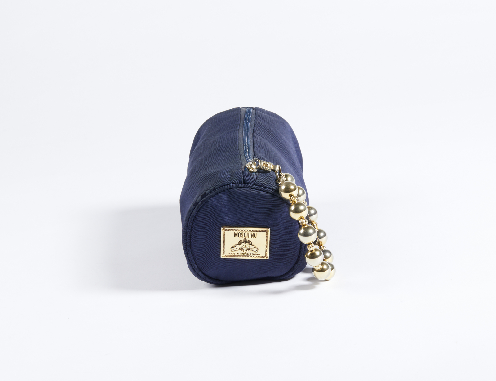 MOSCHINO COUTURE Pochette blu. Tela. Cm 22,50 x 11,00. Borsa a mano di colore blu con hardware color oro. Forma cilindrica. Logo moschino bags a lato. Chiusura con zip.