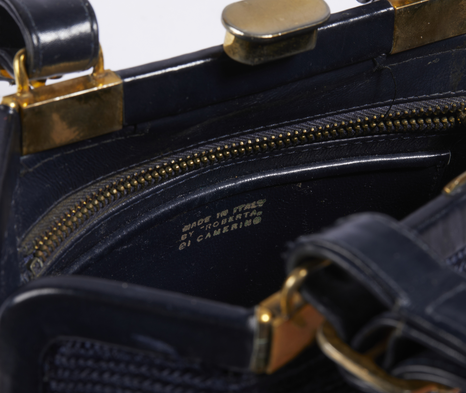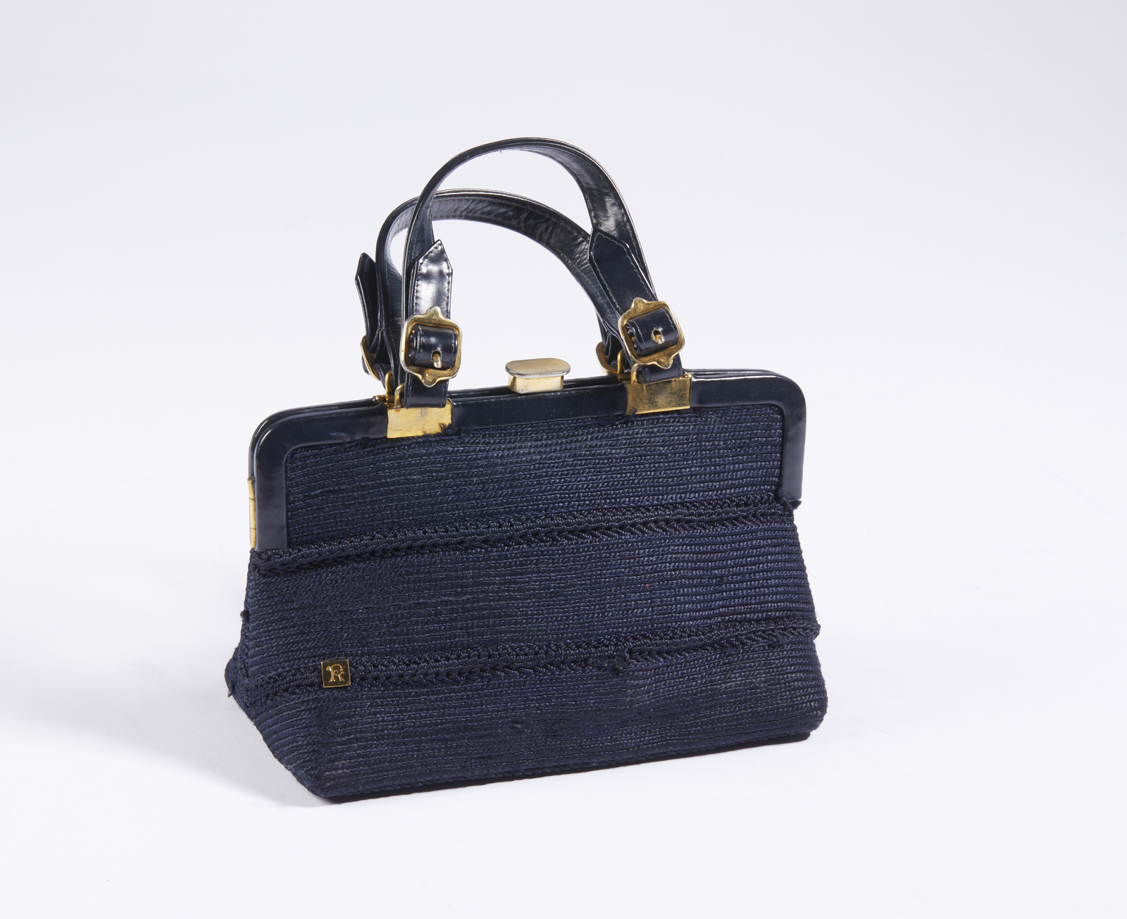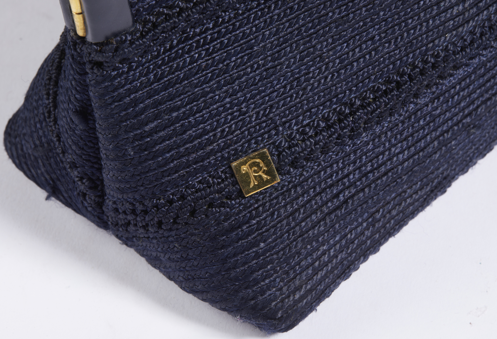 DI CAMERINO ROBERTA (1920 - 2010) Borsetta a mano blu. rafia e pelle. . Borsetta a mano Roberta di Camerino vintage in rafia blu scura, profili e due manici in pelle blu, con elementi in hardware dorati, chiusura a scatto, logo R sul fronte in basso, firma all'interno in caratteri dorati Made in Italy/ by Roberta di Camerino. Una taschina interna chiusa da zip, una taschina interna aperta.